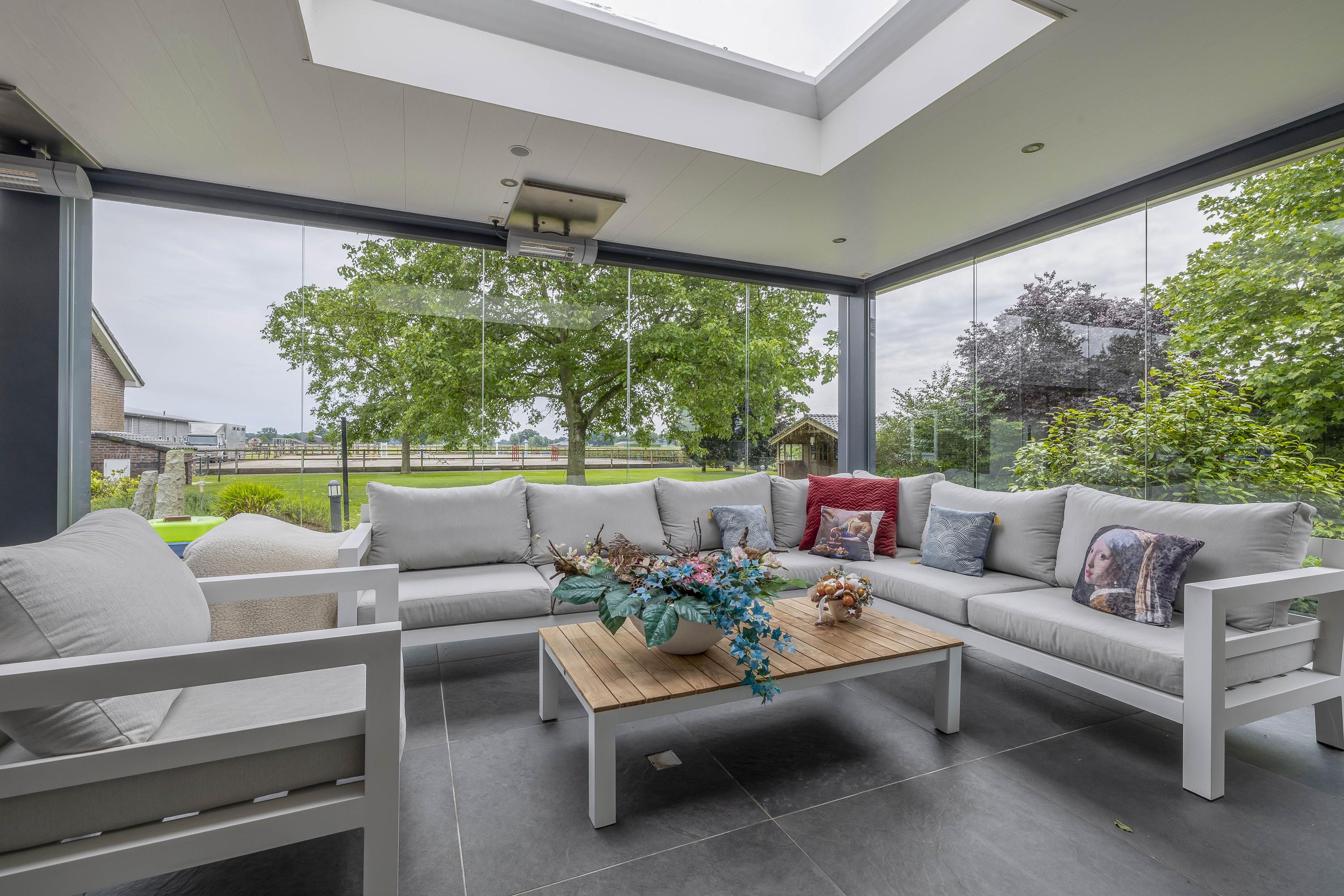 De tuin is voorzien van een royaal overdekt terras met glazen schuifwanden, zodat u het hele jaar door kunt genieten van het buitenleven. Vanuit het terras heb je een fraai uitzicht op de tuin en zelfs op de buitenpiste. Daarnaast is er een tuinhuis, een uitgestrekt gazon en diverse volwassen bomen en struiken aanwezig. Voor extra gemak beschikt de tuin over een beregeningsinstallatie. Het erf is grotendeels voorzien van betonklinkers. Een gedeelte, de weg tot aan de garage is afgewerkt met gebakken klinkers. Het deel vanaf de weg, naast de stal en tot aan de achterzijde van de stal is voorzien van gebroken asfalt. Er zijn 2 opritten aanwezig, er is een aparte oprit die toegang biedt tot de accommodatie.
