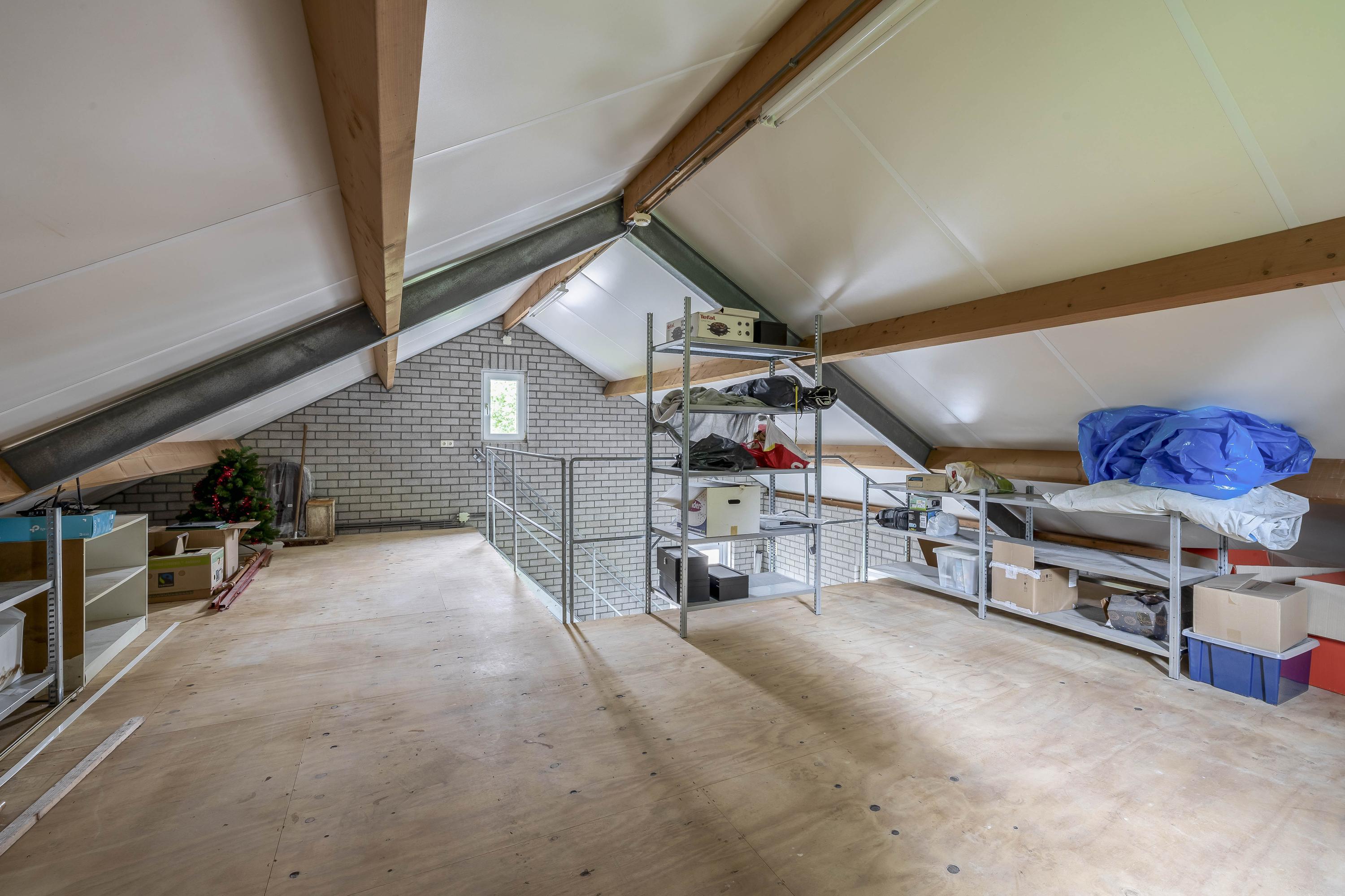 De vrijstaande garage is opgetrokken uit metselwerk gevels, stalen spanten en een met pannen gedekt dak. De volledig geïsoleerde garage beschikt over maar liefst drie verdiepingen, die dankzij een vaste trap gemakkelijk toegankelijk zijn.