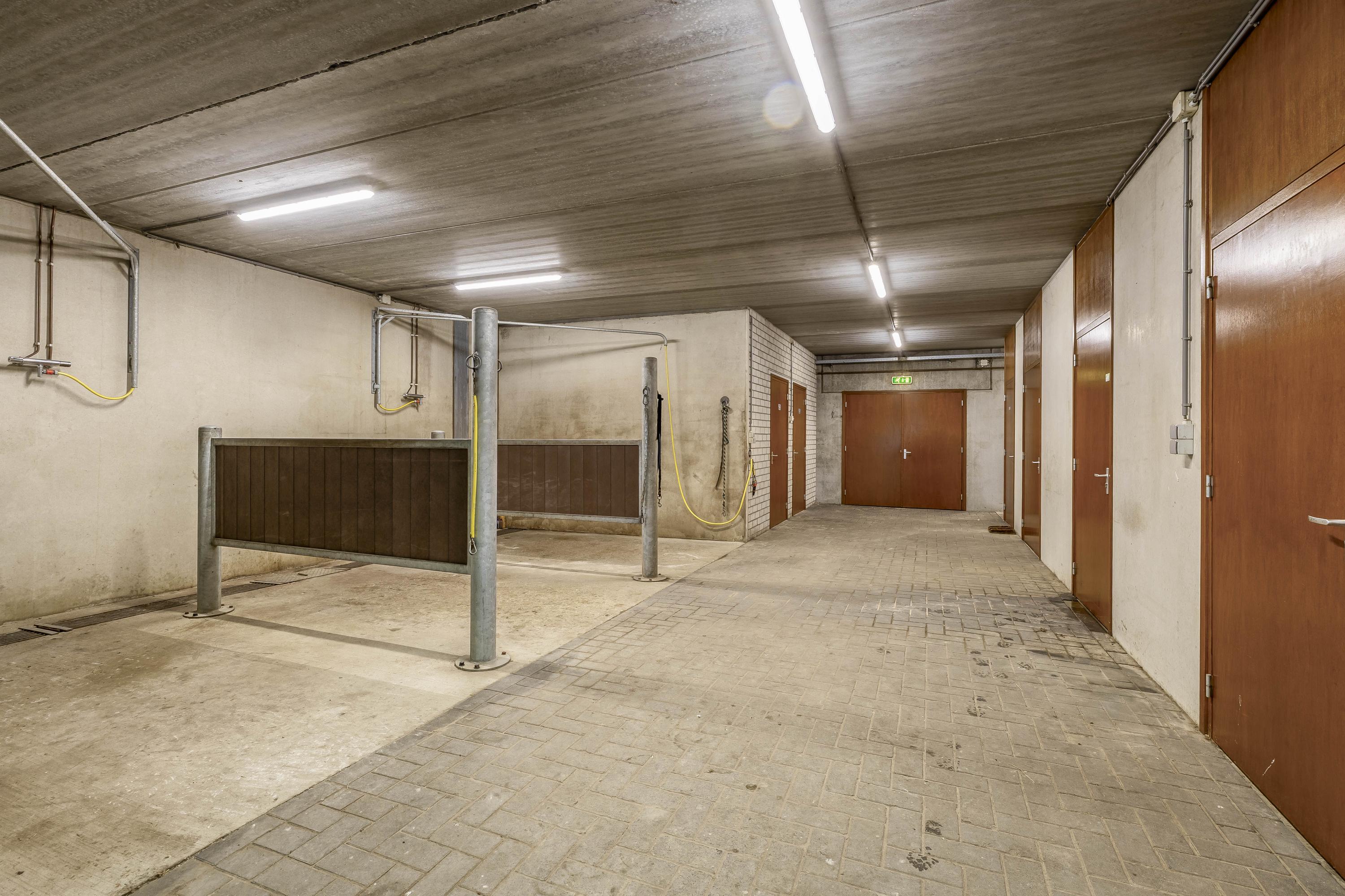 Middels een loopdeur is er toegang tot de stal. Een roldeur zorgt dan weer voor toegang tot de binnenpiste. Er zijn praktische magazijnopstellingen opstellingen gesitueerd. Er is krachtstroom aanwezig en een hogedrukleiding voor het reinigen van de stallen. Een elektrische roldeur en een loopdeur zorgen voor toegang tot het erf. Openslaande deuren zorgen voor toegang tot de rijhal. Daarnaast zijn 10 boxen uitgerust met praktische buitenluiken. Een groot voordeel is de hooizolder met handige hooiluiken, strategisch boven de stallen geplaatst, waardoor hooi en stro eenvoudig direct in de boxen kunnen worden gegooid. Verder draagt de aanwezige sleepketting voor de mest bij aan extra gemak en efficiëntie in het onderhoud van de stallen. Naast de stallen is een douche- en toiletruimte voor heren en dames gesitueerd. Ook zijn er 3 wasplaatsen aanwezig, welke zijn voorzien van een warm- en koud watervoorziening. Via een separate ingang, gelegen naast de zadelkamer is het appartement bereikbaar. Het appartement is afgewerkt met een vinylvloer, deels metselwerk / deels stucwerk wanden en een systeemplafond. Er bergruimte onder de dakschuinte gecreëerd. De woonkamer van het appartement is uitgerust met een keukenblok. Vanuit deze ruimte is er zicht op de binnenpiste. De slaapkamer is voorzien van een praktische inbouwkast. De badkamer is ingericht met een douche, wastafel en een toilet en is geheel betegeld.