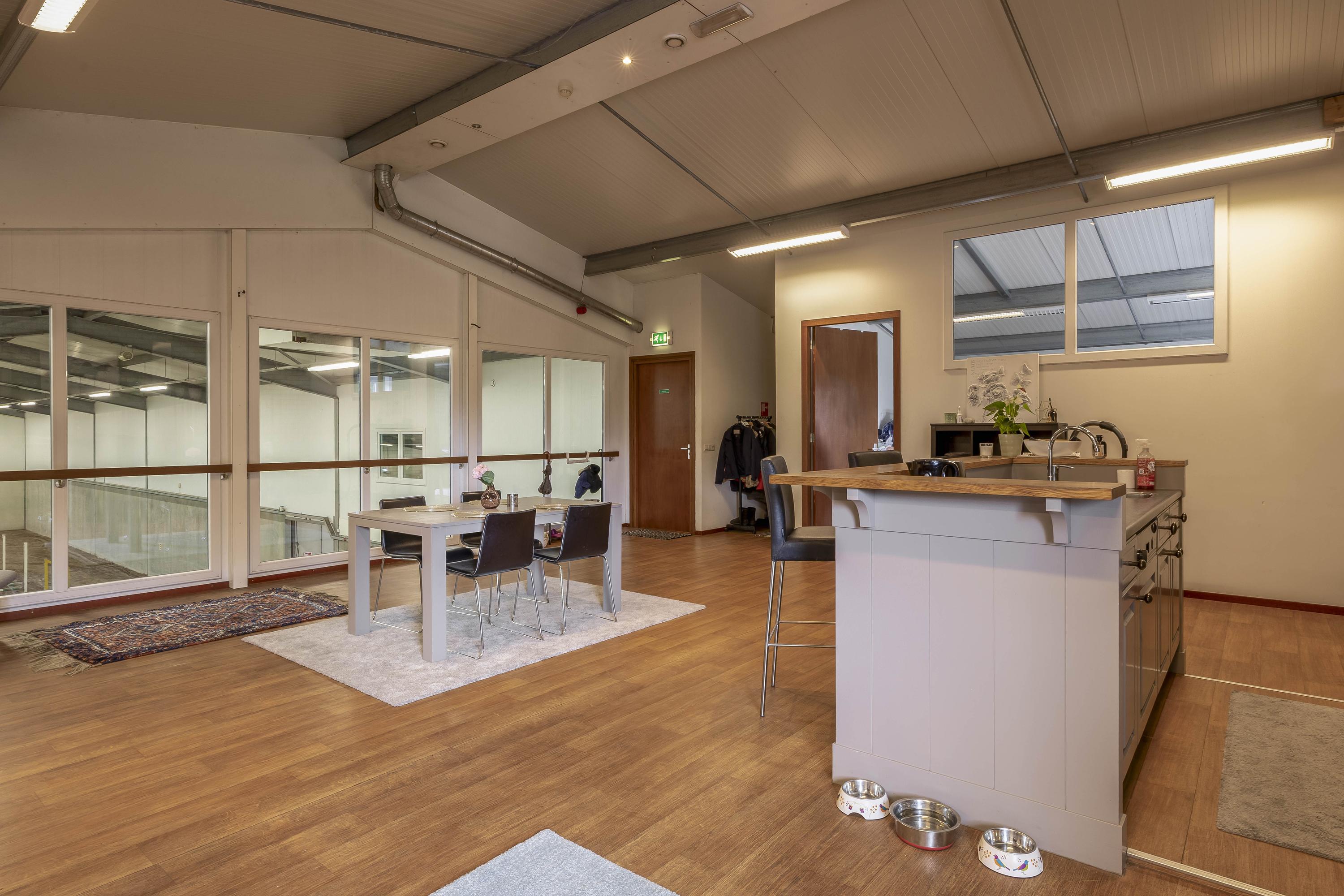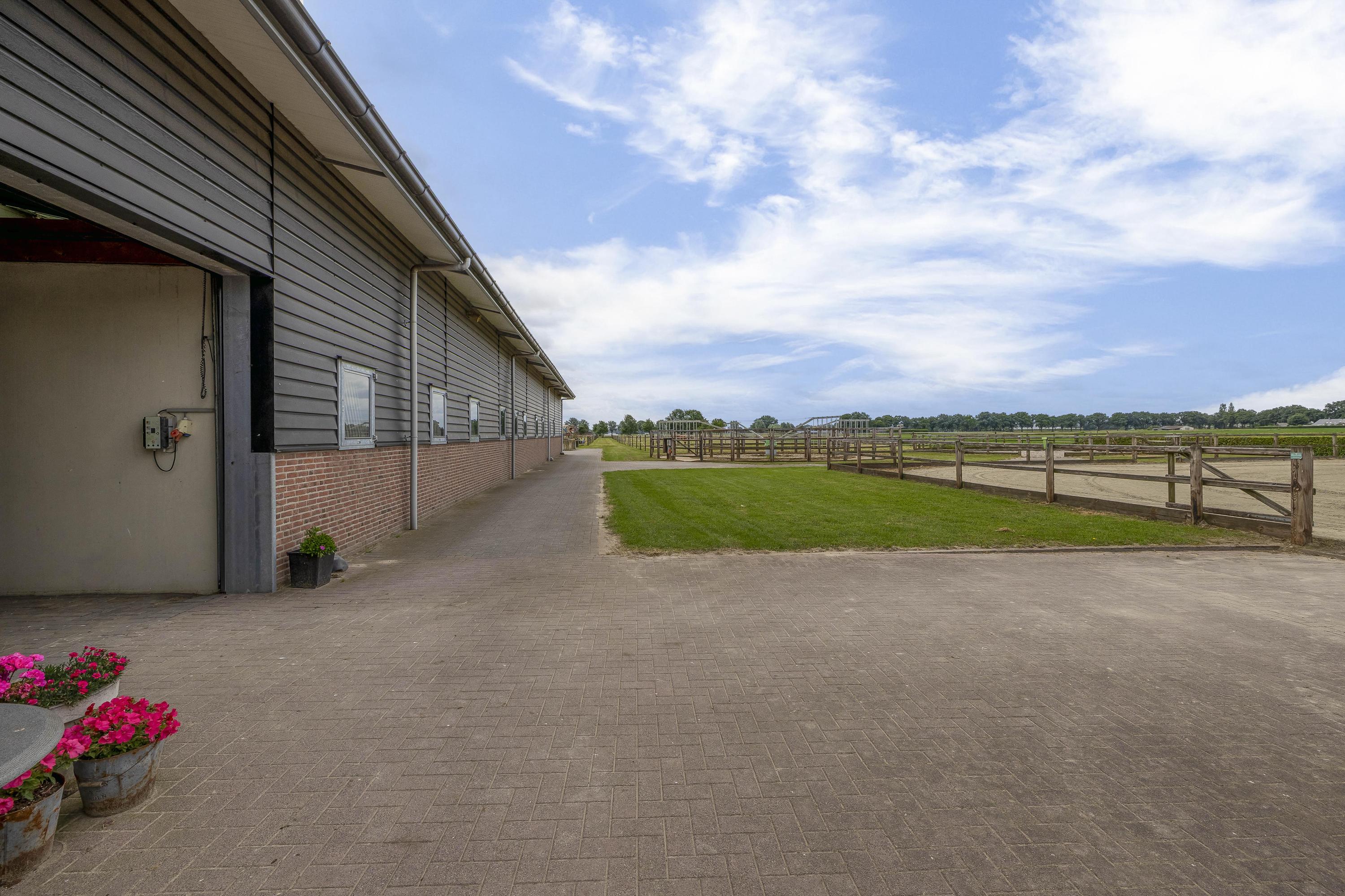 De goed onderhouden hippische accommodatie bestaat uit een vrijstaande rijhal met een binnenpiste (ca. 20x40 mtr.), een stalgedeelte met in totaal 20 paardenboxen, een ontvangstruimte met appartement, een 2e appartement en een loods/werkplaats.. Het erf is verder ingericht met een buitenpiste, 6 buitenstallen, een stapmolen, een longeercirkel, weiland, een mestvaalt. De rijhal is opgetrokken uit metselwerk gevels, stalen spanten en een geïsoleerd dak. De gevels zijn aan de buitenzijde deels gepotdekseld. Lichtdoorlatende platen zorgen voor natuurlijke lichtinval. Aan de binnenzijde zijn de gevels voorzien van betonelementen. De binnenpiste heeft een afmeting van ca. 20mtr. x 40mtr. en is uitgerust met een eb-vloed bodem. Er is een heather aanwezig. De piste is voorzien van verlichting. De wanden zijn van beton. Een roldeur in de achtergevel en een loopdeur in de zijgevel zorgen voor toegang. Het stalgedeelte is uitgerust met maar liefst 20 paardenboxen, waarvan de voorwanden deels zijn uitgevoerd in kunststof en deels in gegalvaniseerd staal. De boxen hebben betonnen tussen- en achterwanden en zijn voorzien van schuifdeuren. Aan de voorzijde van de hal is de loods/werkplaats gelegen welke is voorzien van een betonnen vloer en wanden en een betonplaten plafond. Aan de rechterzijde is de vaste trap gesitueerd naar de ontvangstruimte en het appartement op de 1e verdieping. De ruime ontvangstruimte is voorzien van een PVC-vloer en deels metselwerk/ deels stucwerk gevels. Er is een keukenblok gesitueerd welke is uitgerust met een gootsteen en een koelkast en bergruimte. De slaapkamer beschikt over dezelfde afwerking als de ontvangstruimte. De badkamer is uitgerust met een douche en een wastafel. Ook is er een zwevend toilet aanwezig. Vanuit de ontvangstruimte is er een fraai zicht op de binnenpiste. In de berging zijn de aansluitingen voor de wasapparatuur, de unit voor de vloerverwarming, de opstelling voor de CV-ketel (Nefit Topline) en de omvormer voor de zonnepanelen gesitueerd. De stro opslag aan de achterzijde van de rijhal is afgewerkt met een betonnen vloer. De voersilo is hier gesitueerd. Een roldeur aan de achtergevel en een loopdeur zorgen voor toegang tot het erf. Het dak is geïsoleerd.