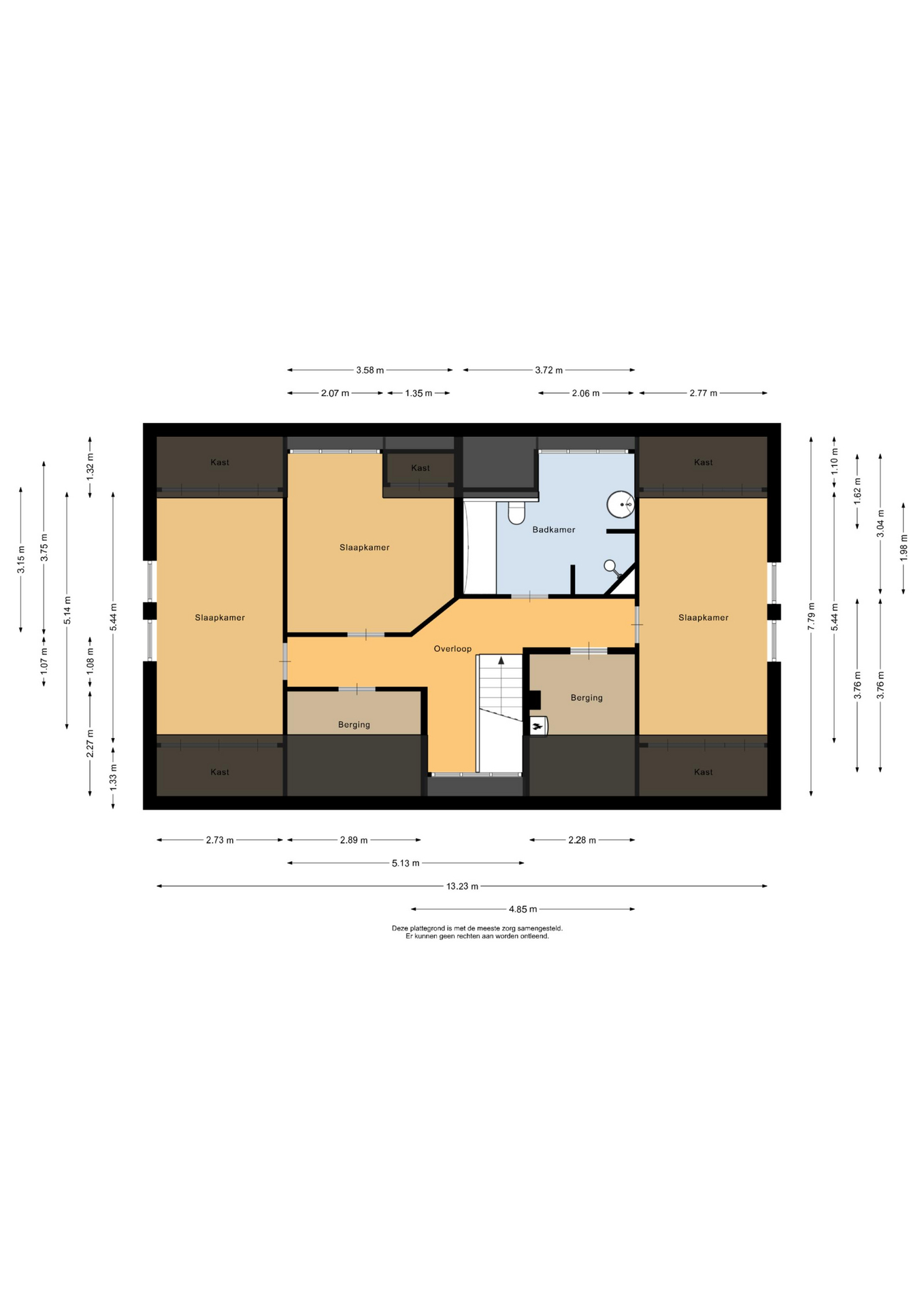 De ruime overloop met vide biedt toegang tot 3 slaapkamers, een badkamer en een technische/stookruimte. In de technische ruimte is het stofzuigsysteem, de WTW-installatie en de boiler gesitueerd. Slaapkamer I en III zijn beiden voorzien van een laminaatvloer, spuitwerk wanden en een spuitwerk plafond. In beide ruimtes is bergruimte gecreëerd onder de dakschuinte door middel van praktische schuifkasten. Twee ramen in de kopgevel zorgen voor natuurlijke lichtinval. Slaapkamer II is eveneens voorzien van een laminaatvloer, spuitwerk wanden en een spuitwerk plafond. Een dakkapel zorgt voor natuurlijke lichtinval en ventilatie in de ruimte. De ruime, geheel betegelde badkamer is uitgerust met een ligbad, wastafel met wastafelmeubel, douche, toilet en een designradiator. Een praktisch pluspunt van deze badkamer is de handige stortkoker voor de was. De koker mondt uit in de keuken, waardoor de vuile was direct beneden terechtkomt, dicht bij de wasapparatuur. Dit maakt het doen van de was een stuk efficiënter en zorgt voor extra gemak.