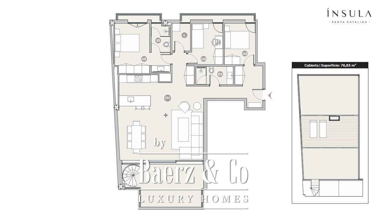 Penthouse Palma combineert licht en hedendaags design in het sfeervolle Santa Catalina. Deze nieuwbouwresidentie, gepland voor oplevering in 2025, ligt op een rustig hoekpunt in een van de meest gewilde wijken van de stad. Het penthouse omvat 234 m², drie slaapkamers en twee stijlvol ingetogen badkamers. De lichte woonruimte sluit naadloos aan op een ruim terras, waardoor binnen en buiten moeiteloos in elkaar overgaan. Een externe trap voert vanaf het hoofdverdiep naar het privé dakterras van circa 80 m², dat panoramische vergezichten biedt en een exclusief uitzicht op de zonovergoten horizon van Mallorca.