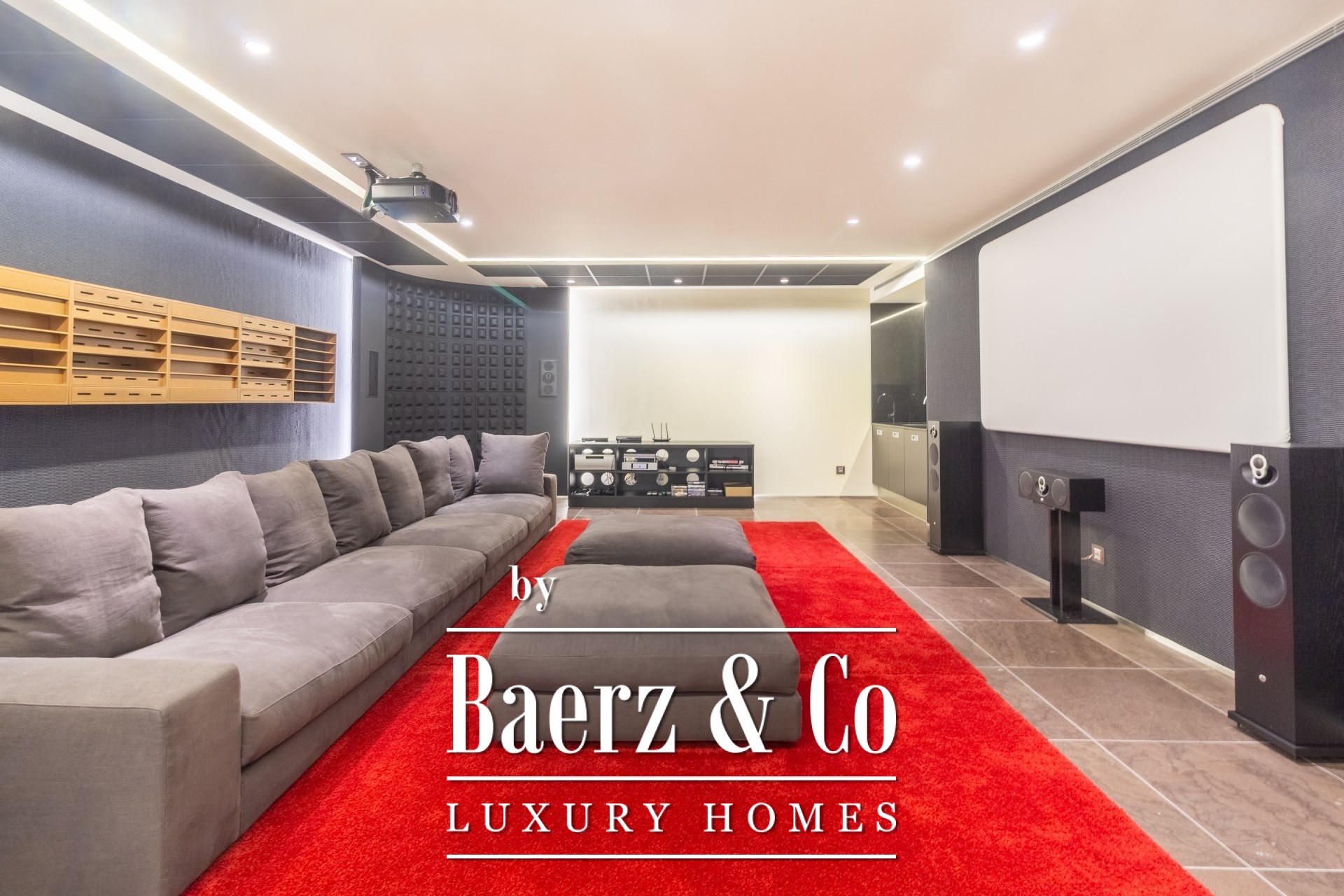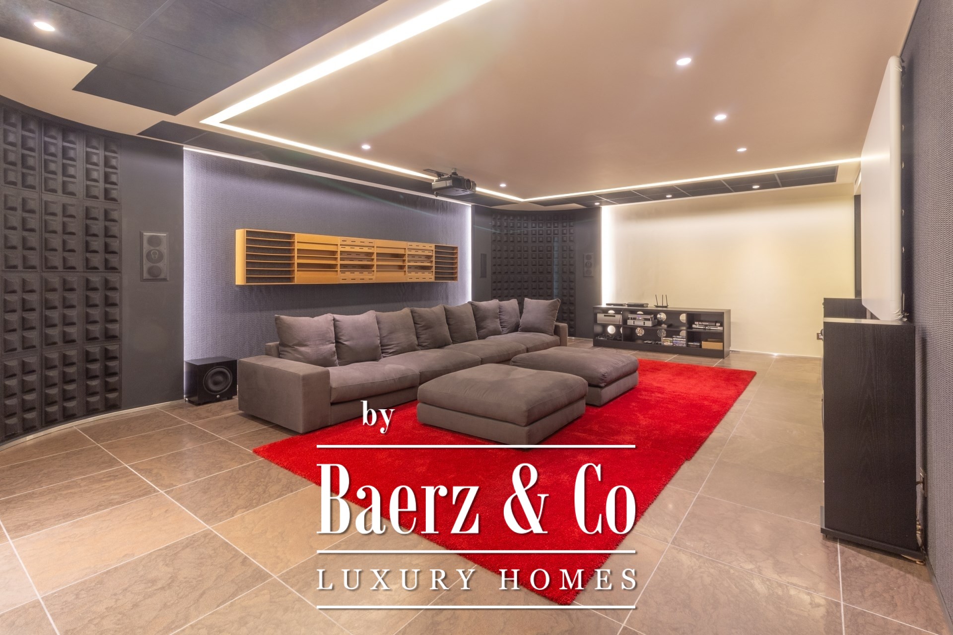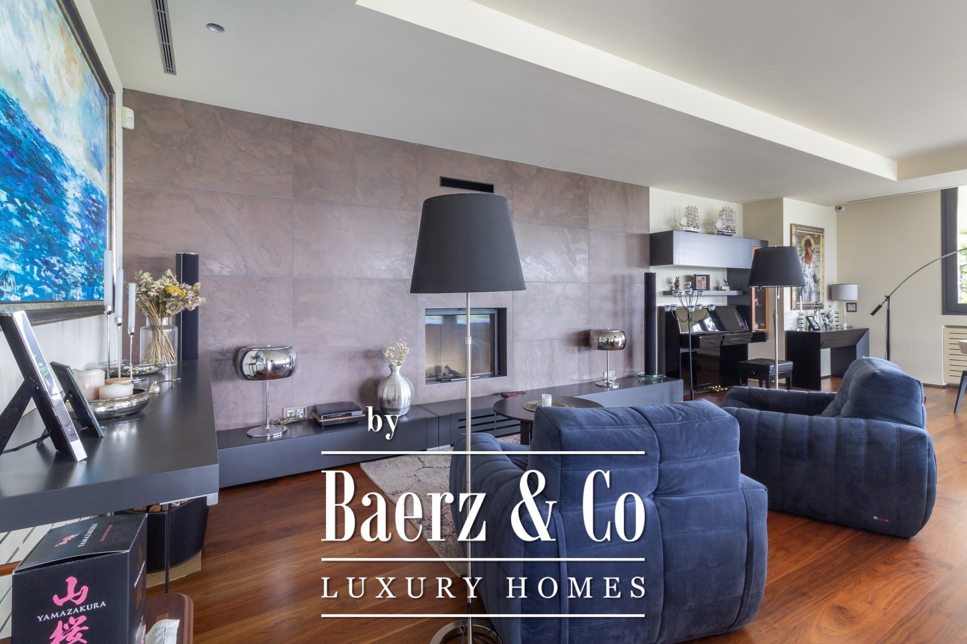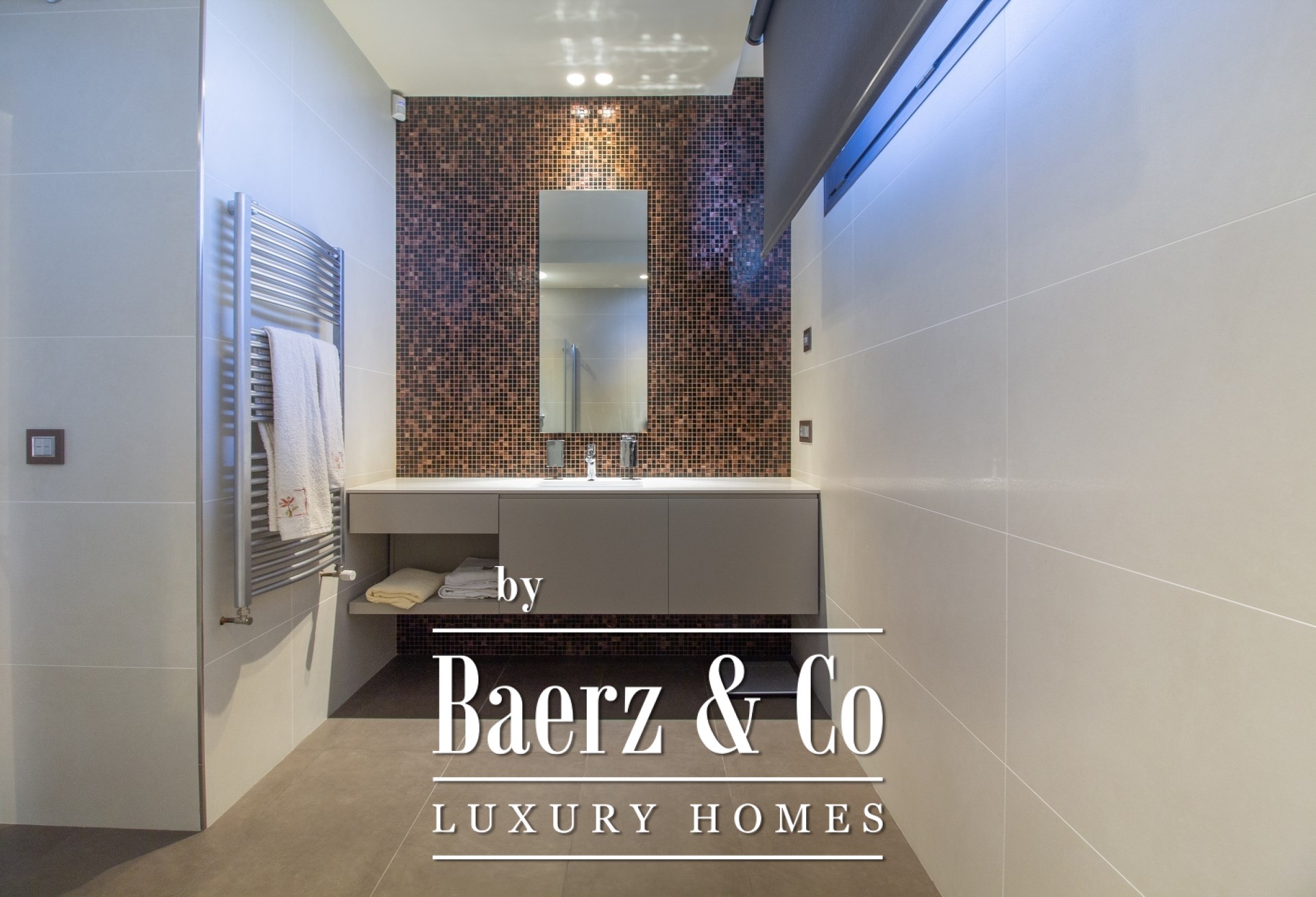 Buiten omringen volgroeide tuinen het zwembad met waterval, een barbecue met buitenkeuken en royale chill-out zones. Vloerverwarming, centrale airconditioning, elektrische ramen, geïntegreerd audiosysteem, volledige beveiliging en een lift benadrukken het comfort en de veiligheid van deze woning.