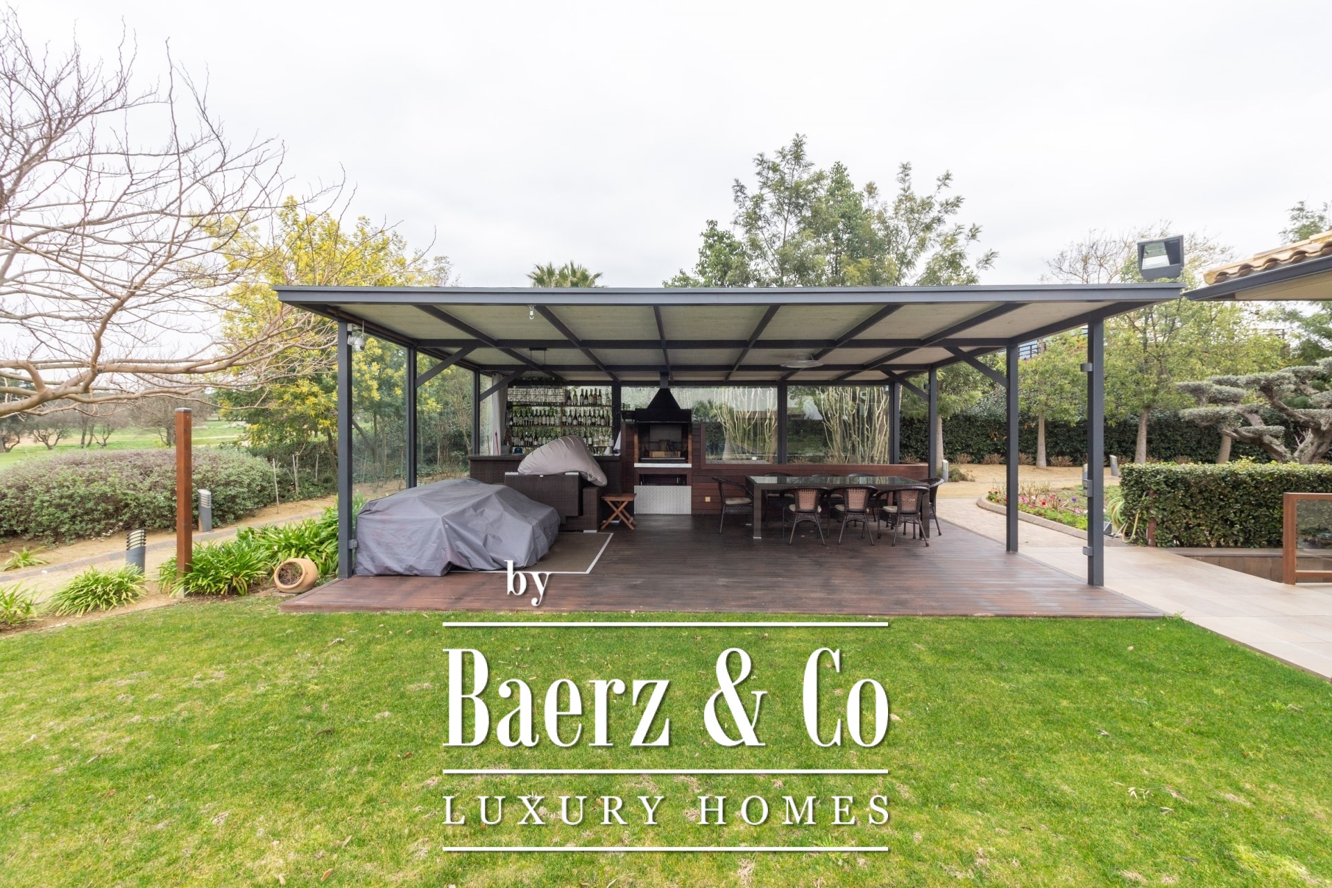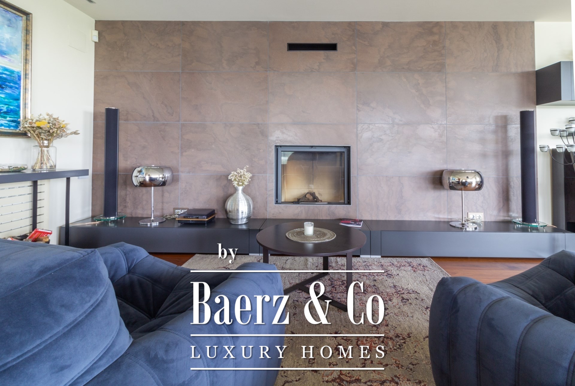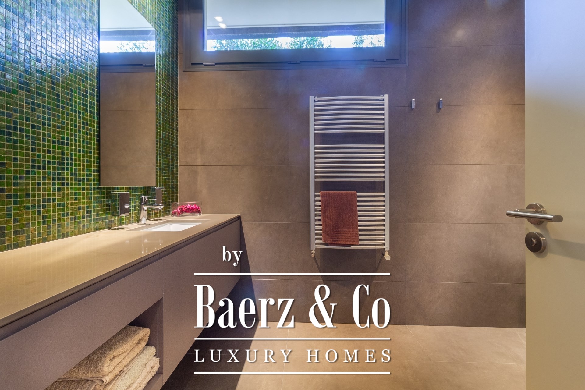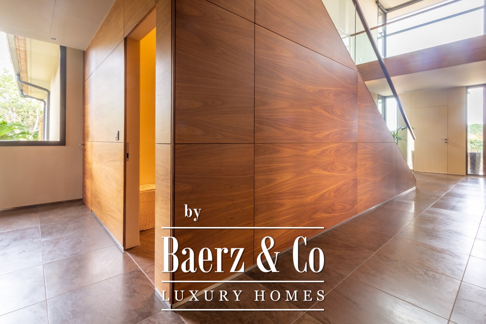 Buiten omringen volgroeide tuinen het zwembad met waterval, een barbecue met buitenkeuken en royale chill-out zones. Vloerverwarming, centrale airconditioning, elektrische ramen, geïntegreerd audiosysteem, volledige beveiliging en een lift benadrukken het comfort en de veiligheid van deze woning.
