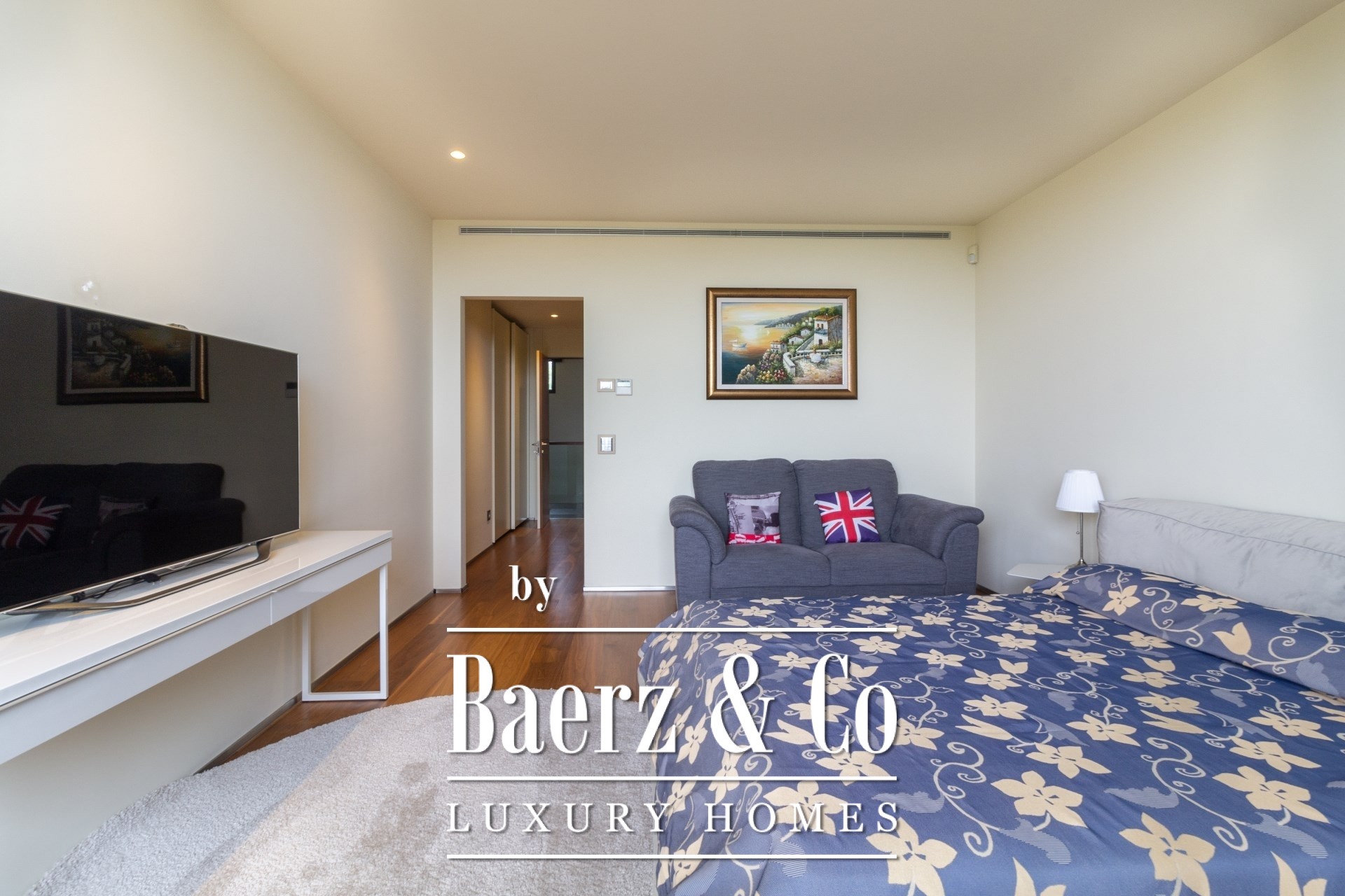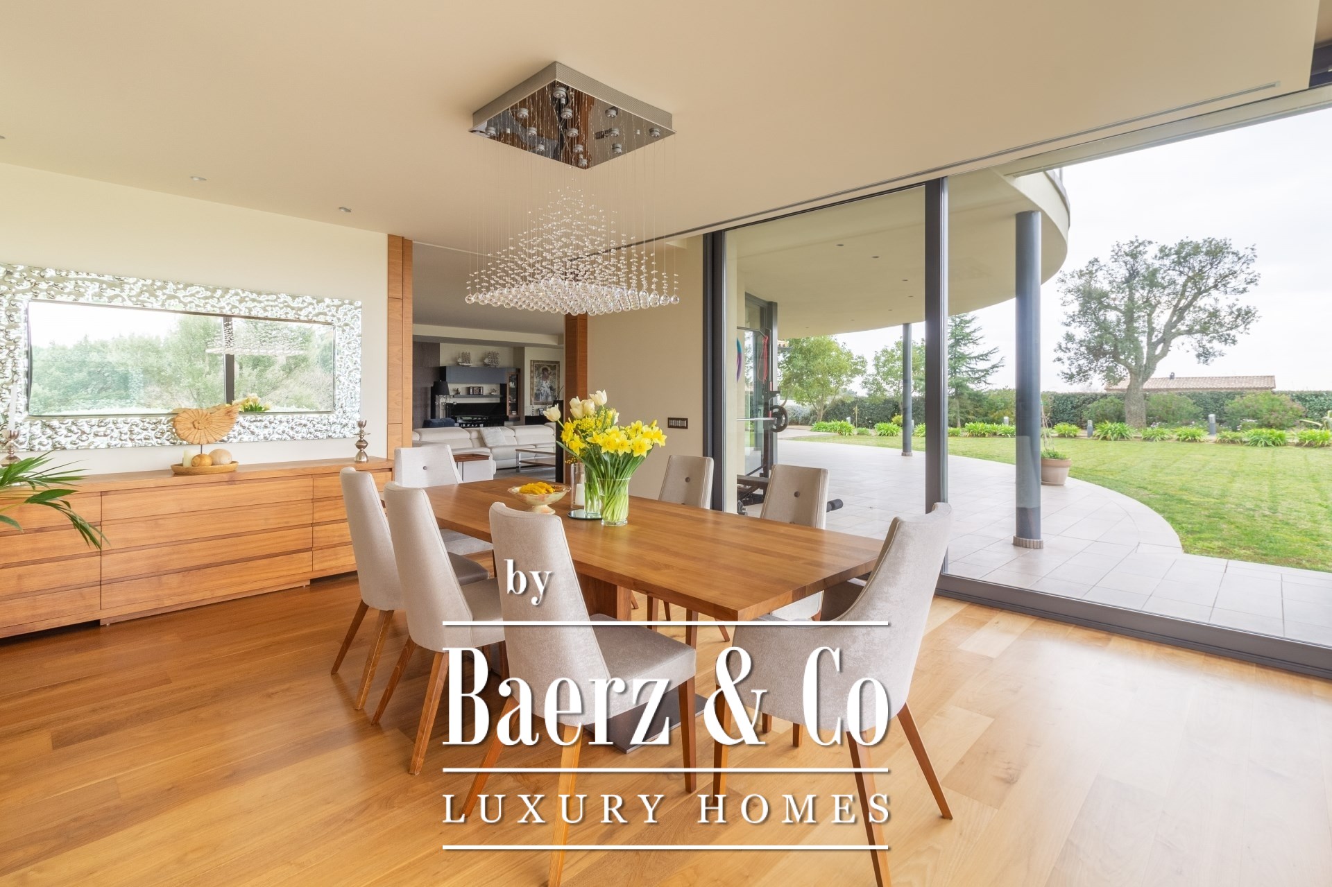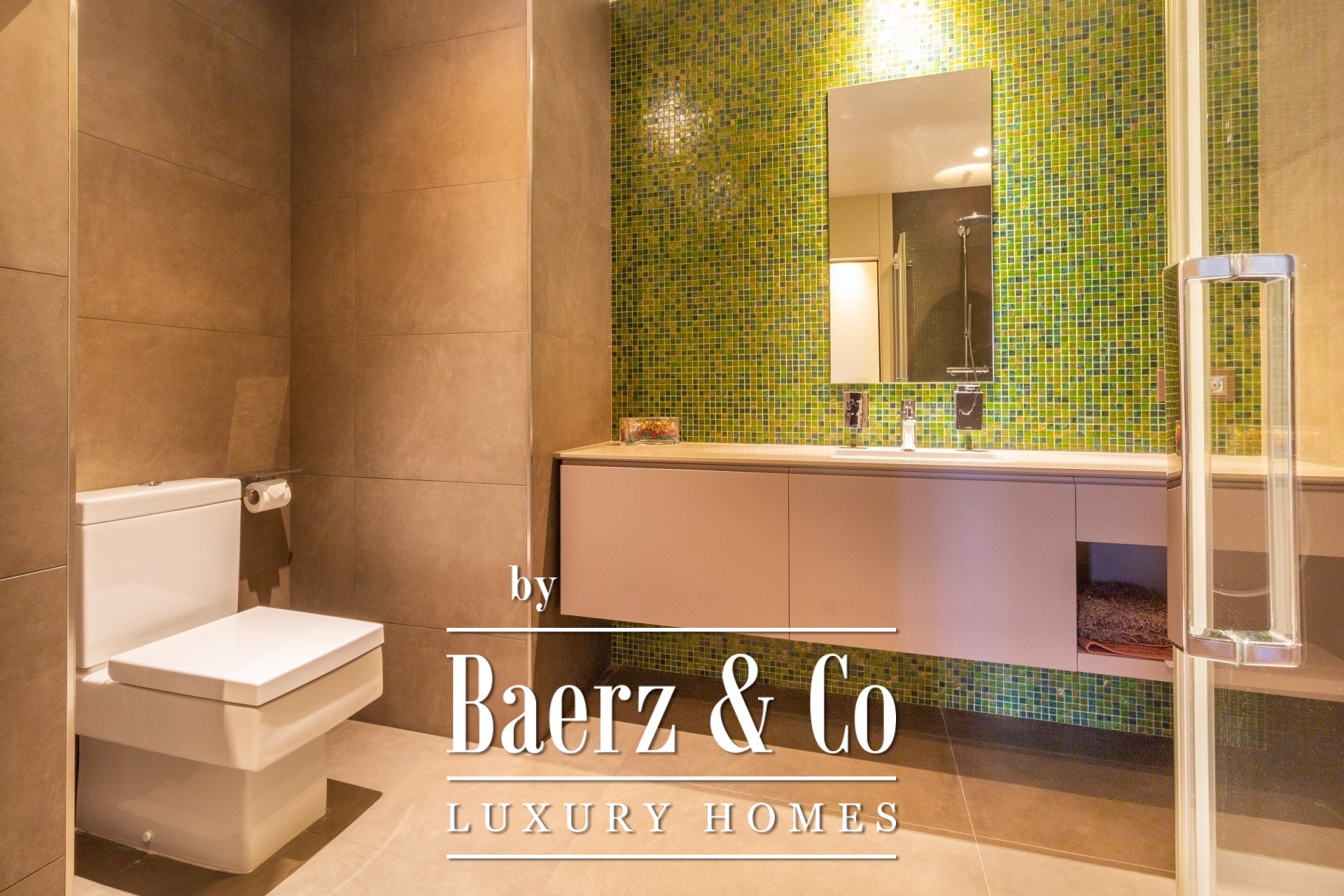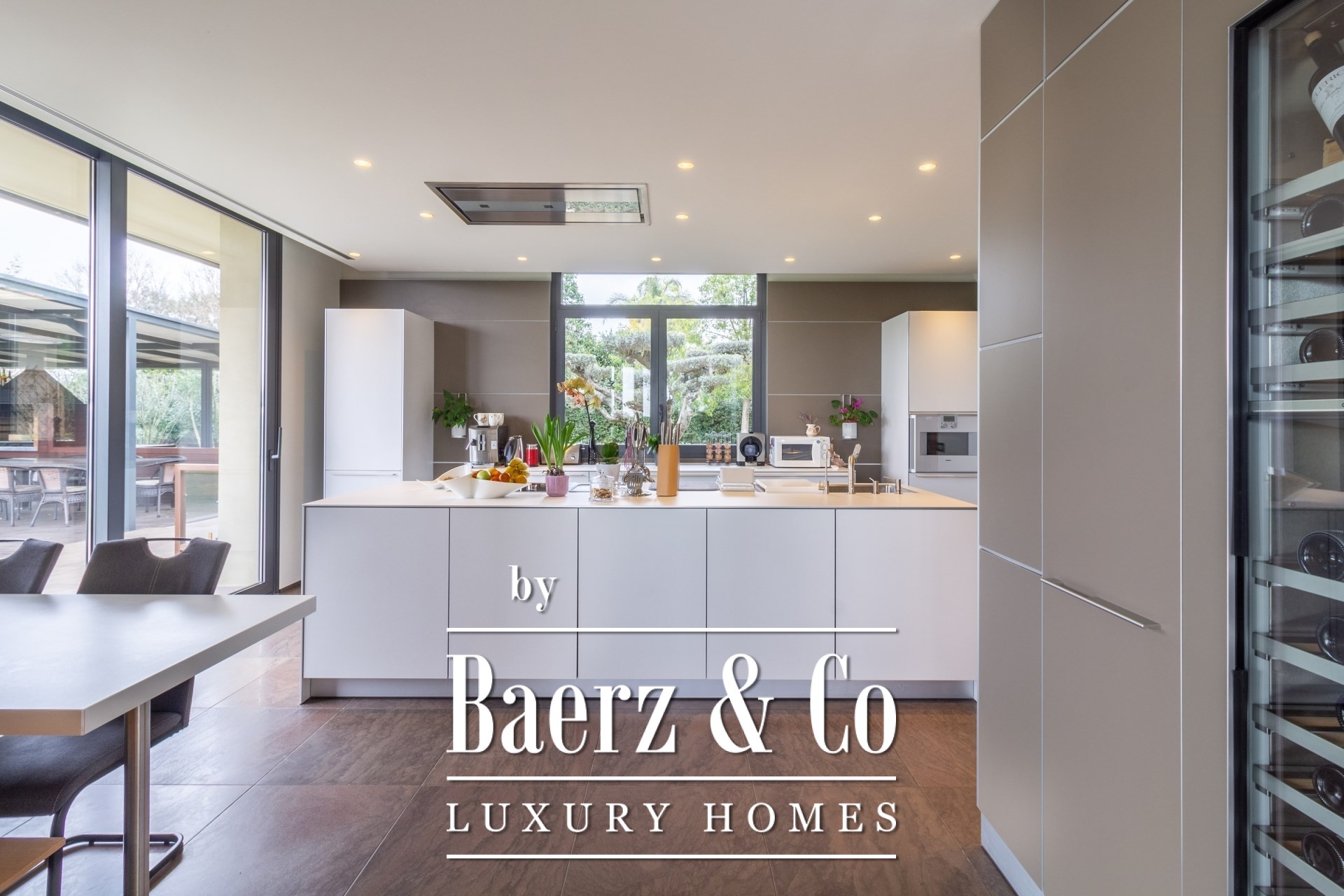 Buiten omringen volgroeide tuinen het zwembad met waterval, een barbecue met buitenkeuken en royale chill-out zones. Vloerverwarming, centrale airconditioning, elektrische ramen, geïntegreerd audiosysteem, volledige beveiliging en een lift benadrukken het comfort en de veiligheid van deze woning.