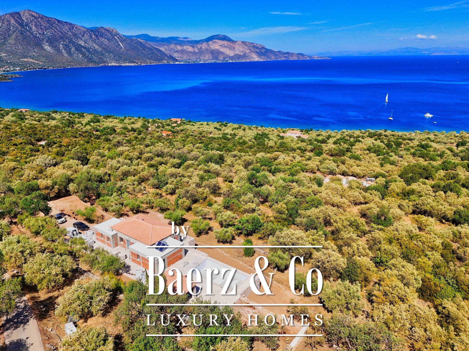 In a location of unique beauty, within a lush olive grove and with unobstructed, magnificent views of the sea and the mountain, a detached house of 235 sq m is available for sale, within a privately owned plot of 4,200 sq m. The house harmoniously combines traditional stone elements with modern lines, while the large internal height further highlights its special, traditional character. It is developed on two levels. On the ground floor, a 70 sq m guest house is provided with a living room, kitchen, bedroom and bathroom, as well as a 20 sq m covered parking