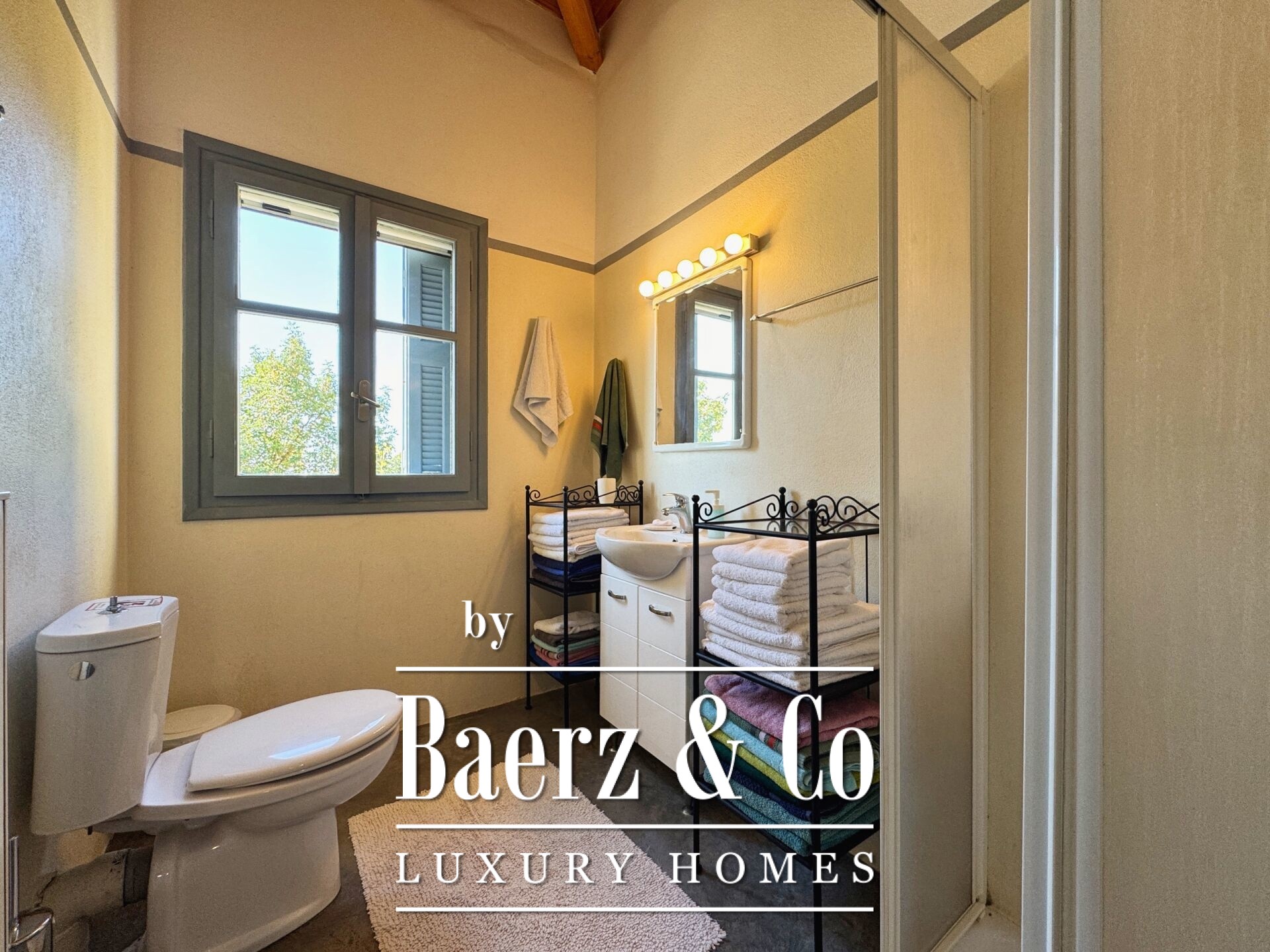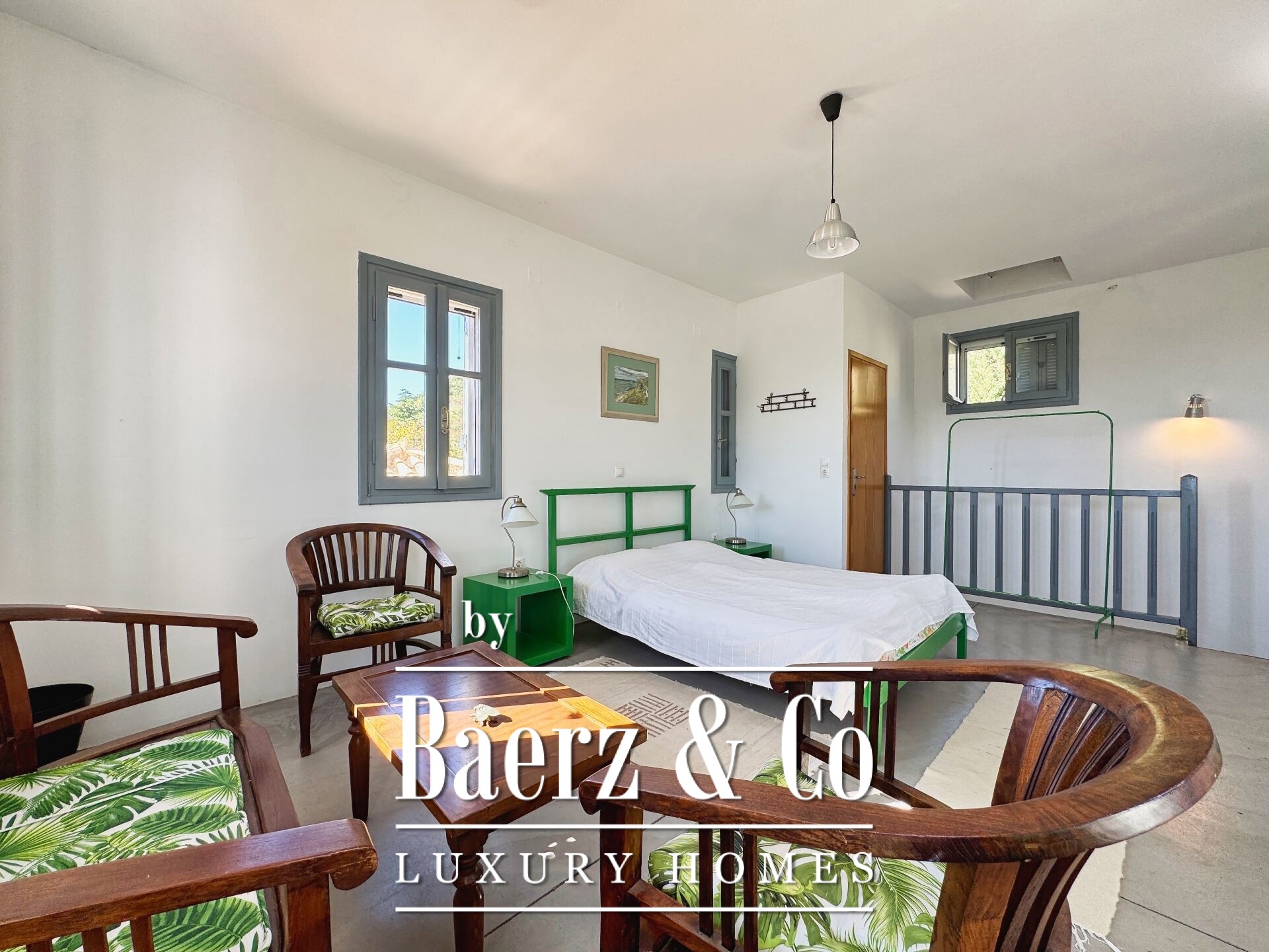 De residentie kenmerkt zich door zorgvuldige steenconstructie en een doordacht ontwerp. De begane grond opent naar een ruime woonruimte en keuken, vijf slaapkamers en vier badkamers, allen hoogwaardig afgewerkt en ontworpen voor privacy en comfort, zowel voor familie als gasten. Interne gangen leiden naar twee karakteristieke stenen torens, die ieder een slaapkamer huisvesten en zorgen voor een uniek gevoel van afzondering in huis en een zeldzaam architectonisch ritme.