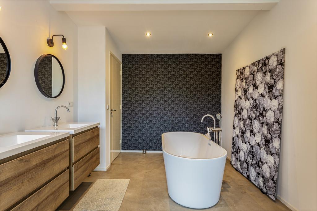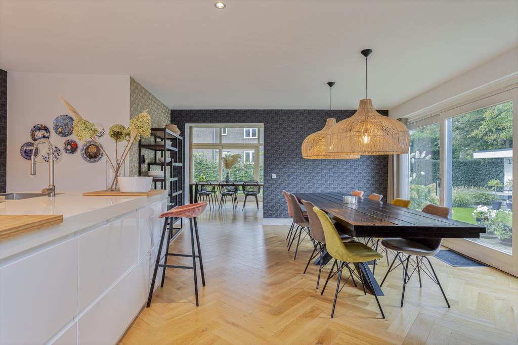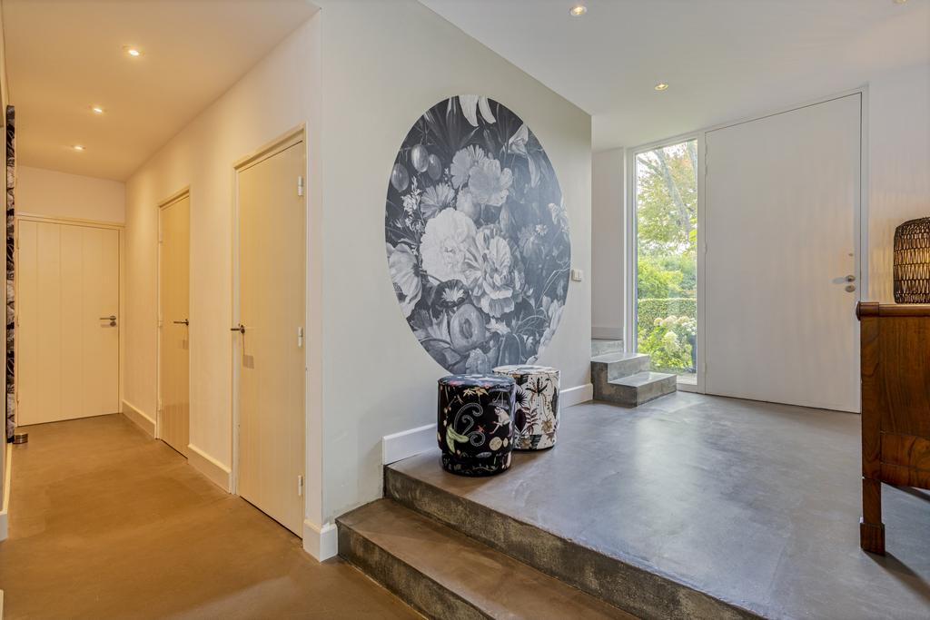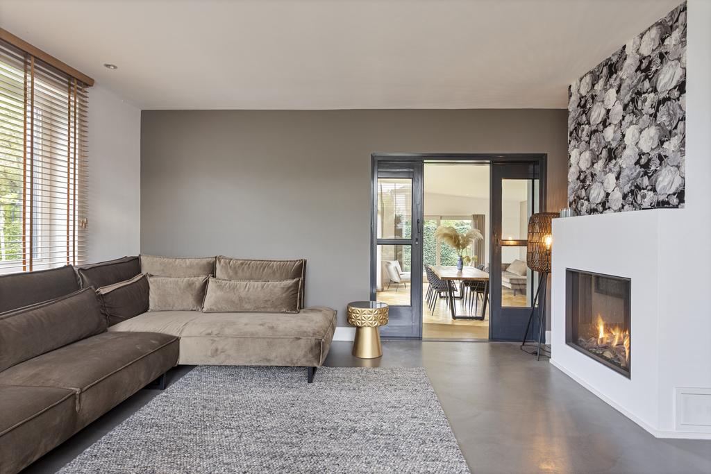 Begane grond: entree, ruime ontvangsthal en doorgang naar de linker- en achtervleugel van de woning met leuke, speelse hoogte verschillen en een knusse, doch ruime TV- kamer (ca. 22 m2) met haardpartij, eetkamer (ca. 30 m2) met fraai tuincontact en de zeer fraaie leef- keuken (ca. 36 m2) eveneens met prachtig tuincontact. De zij- en achtertuin zijn middels een viertal schuifpuien te bereiken. Alle ruimtes zijn of met een betonlook vloer of met een houten visgraad vloer afgewerkt. De keuken is uitgevoerd in een eilandopstelling en voorzien van alle benodigde inbouwapparatuur.