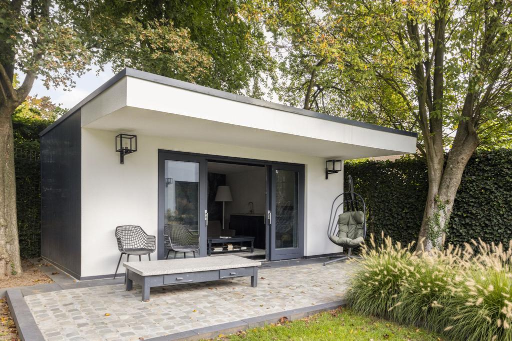 Los van de vrijstaande garage rechts achter in de tuin is er links achter in de tuin een waar "gastenverblijf" gerealiseerd (ook ideaal voor opgroeiende kinderen of werken aan huis?). Dit verblijf is ca. 20 m2 groot en bestaat uit een woon- of werkkamer, doucheruimte, toilet, keukenwand en overdekt terras.
