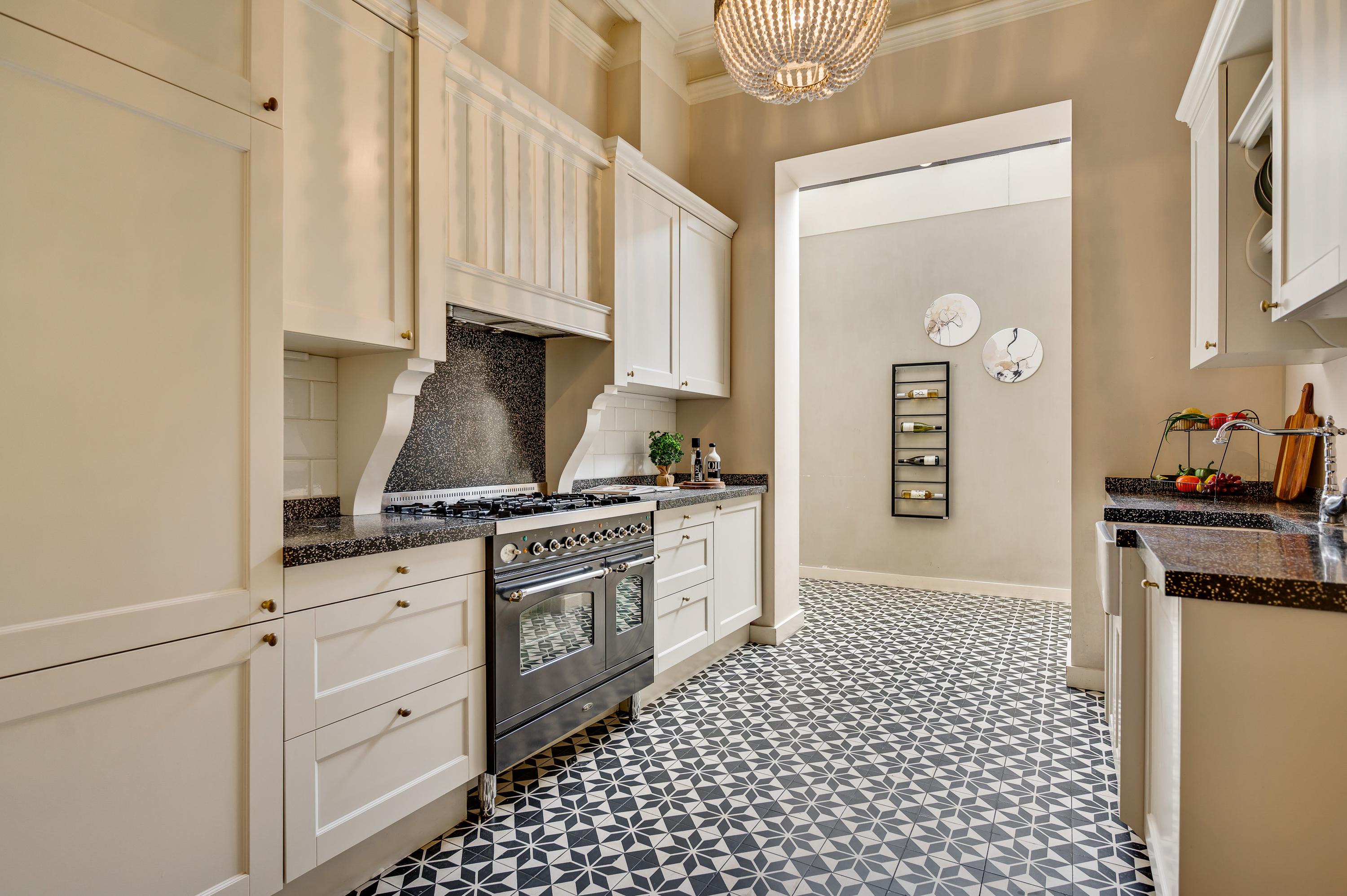 Vanuit de statige hal bereikt u de indrukwekkende woonkeuken van circa 25 m². Deze is uitgerust met een luxe keukenopstelling die klassiek vakmanschap combineert met modern gebruiksgemak. Het terrazzo werkblad, de 6-pits Boretti gasfornuis met dubbele oven, en de hoogwaardige inbouwapparatuur maken deze keuken tot het kloppende culinaire hart van het huis. De klassieke tegelvloer en de hoge paneeldeuren die de keuken van de eetkamer scheiden, benadrukken het verfijnde karakter van de woning.