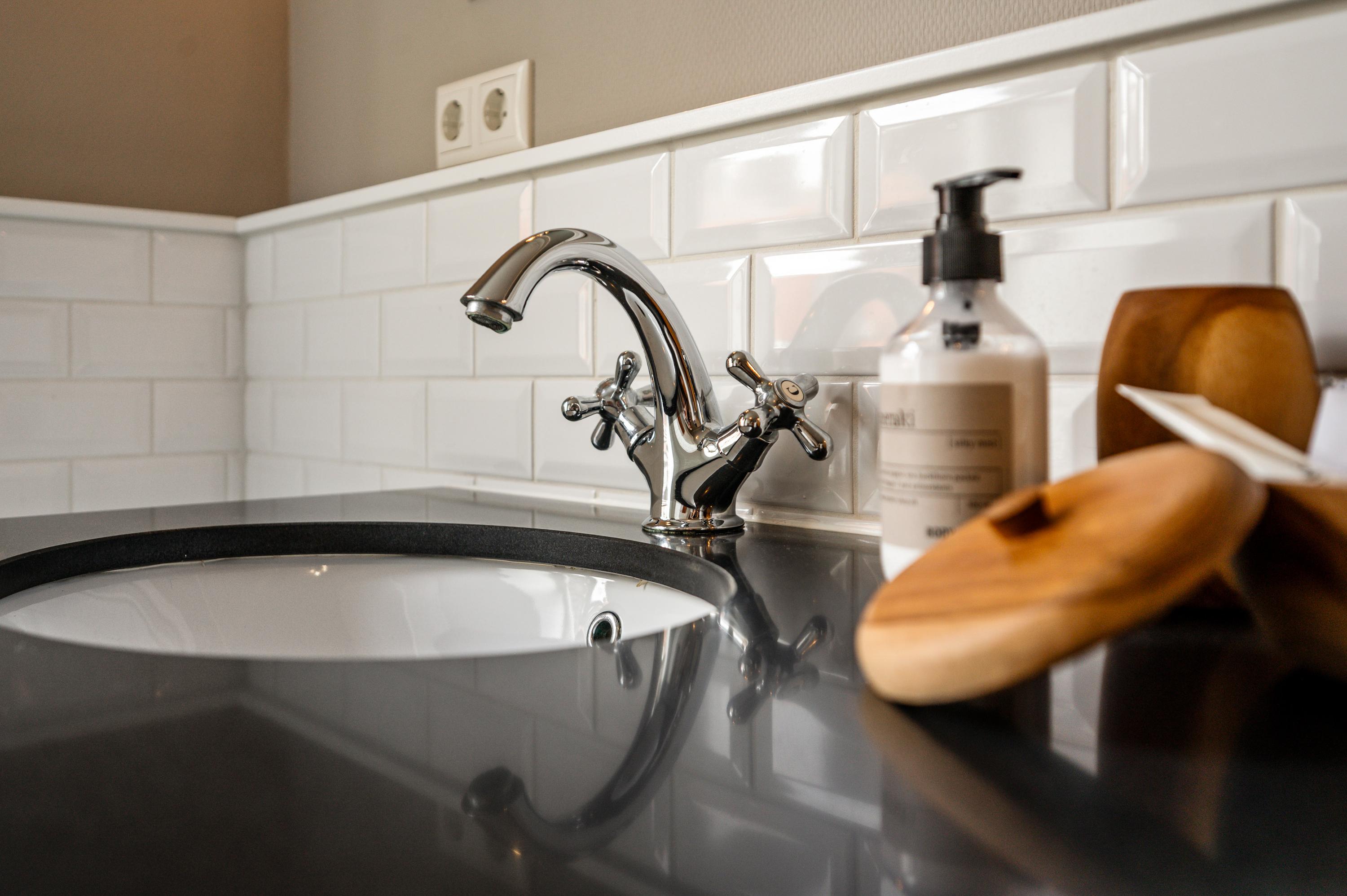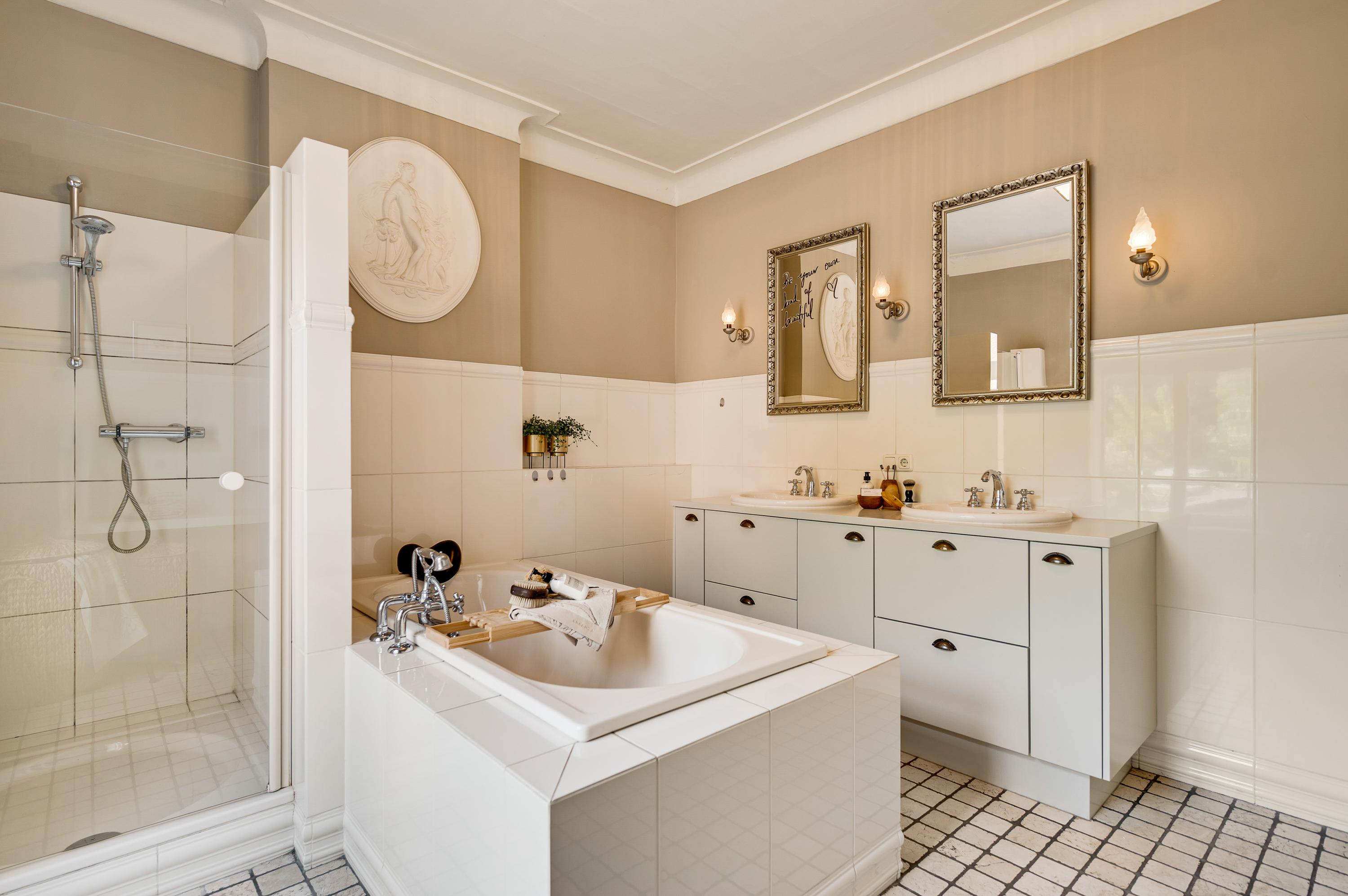 De badkamer is voorzien van een dubbele wastafel, ligbad en douche.