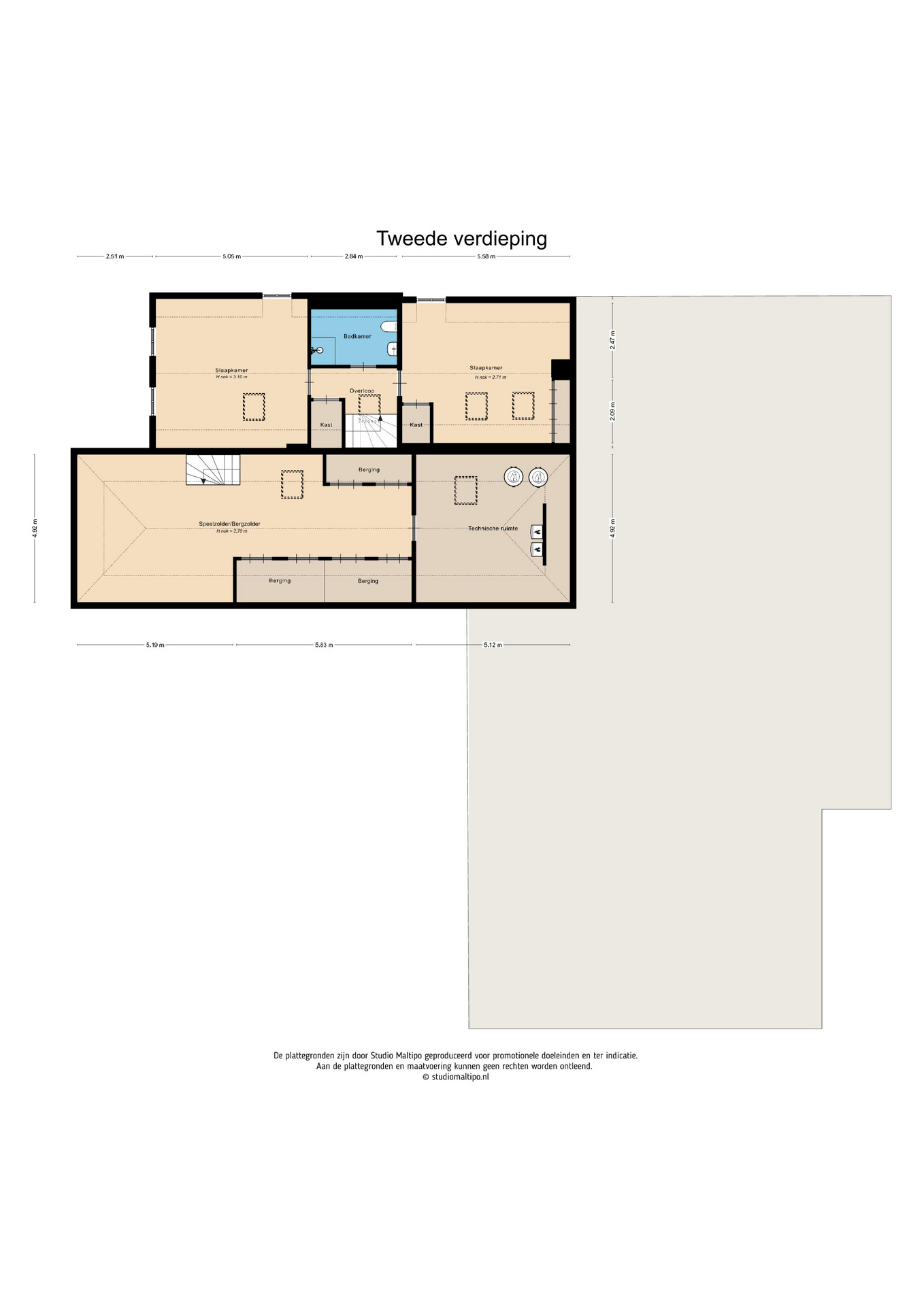 Twee slaapkamers, een 4e badkamer, een speelzolder en een technische ruimte op de tweede verdieping.