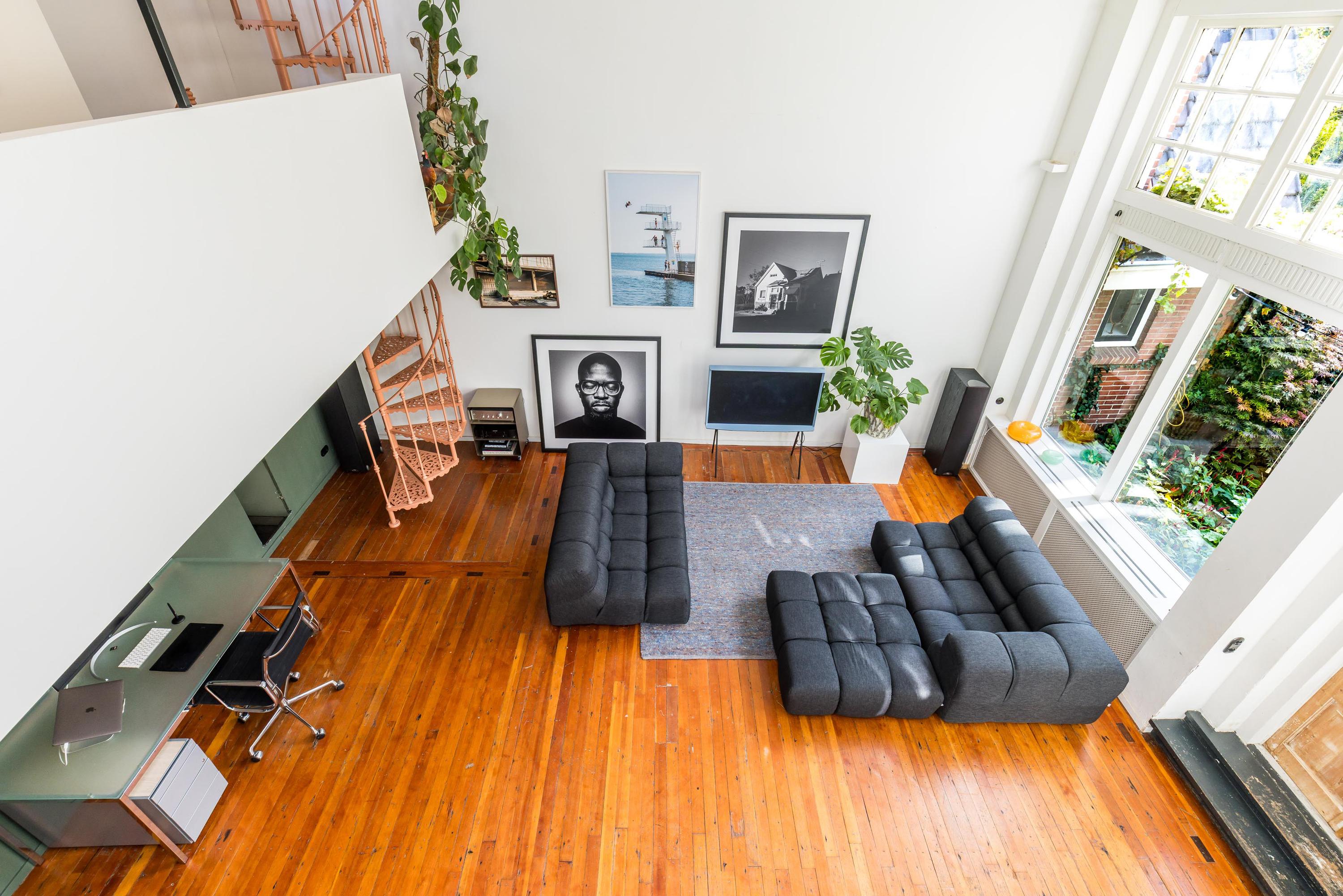 Binnen valt direct de woonkamer op: een indrukwekkende ruimte met hoogte, licht en karakteristieke details zoals hoge deuren en een opvallende wenteltrap. Aansluitend bevindt zich de leefkeuken, het hart van het huis, met een open haard, een knusse zithoek en volop ruimte om samen te koken en lang te tafelen.