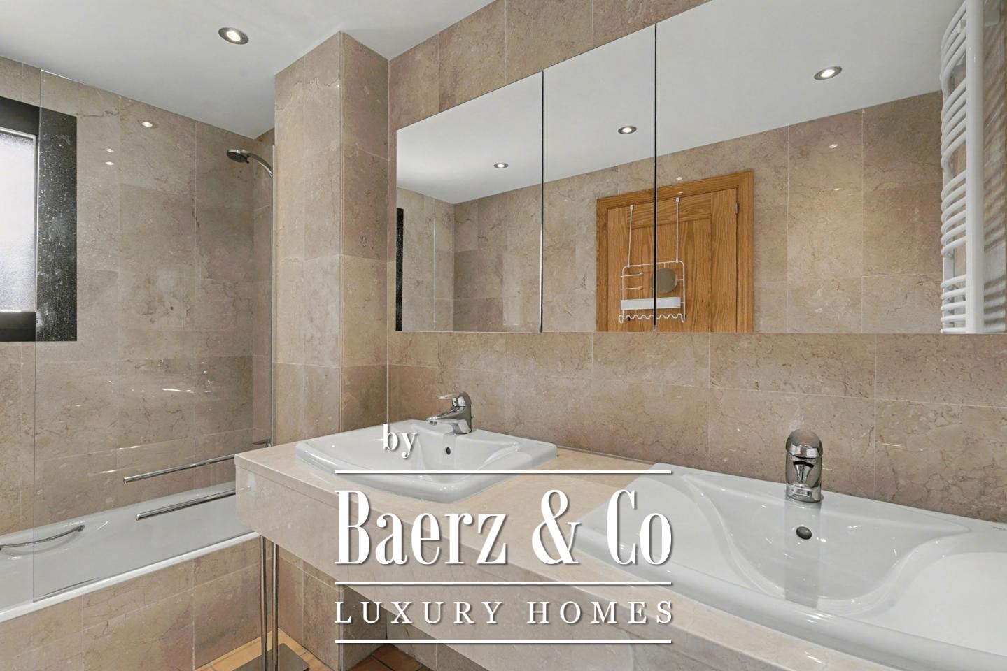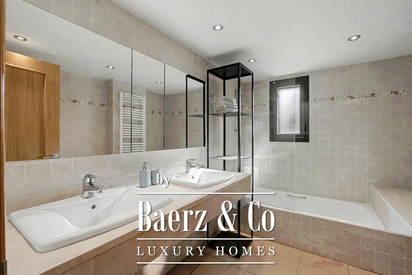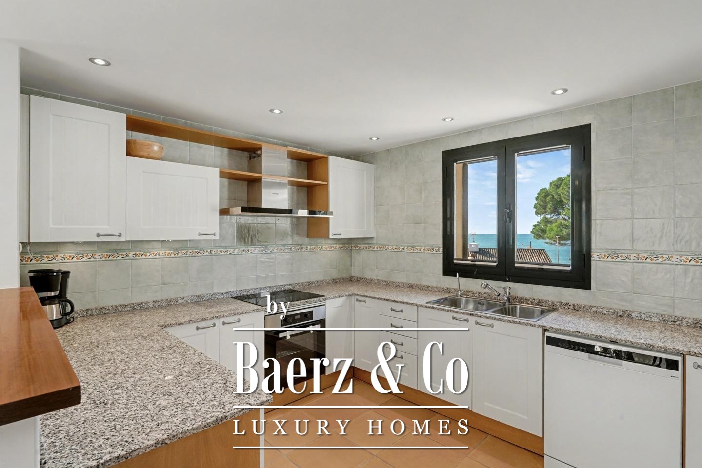 De hoofdslaapkamer beschikt over een en-suite badkamer, terwijl de gastenslaapkamer en de aparte complete badkamer comfort en rust waarborgen. Via de torentrap bereikt u het privé dakterras voor zonuren en een adembenemend uitzicht over de baai. Airconditioning, een alarmsysteem en gezamenlijke parkeergelegenheid bieden extra comfort en veiligheid.