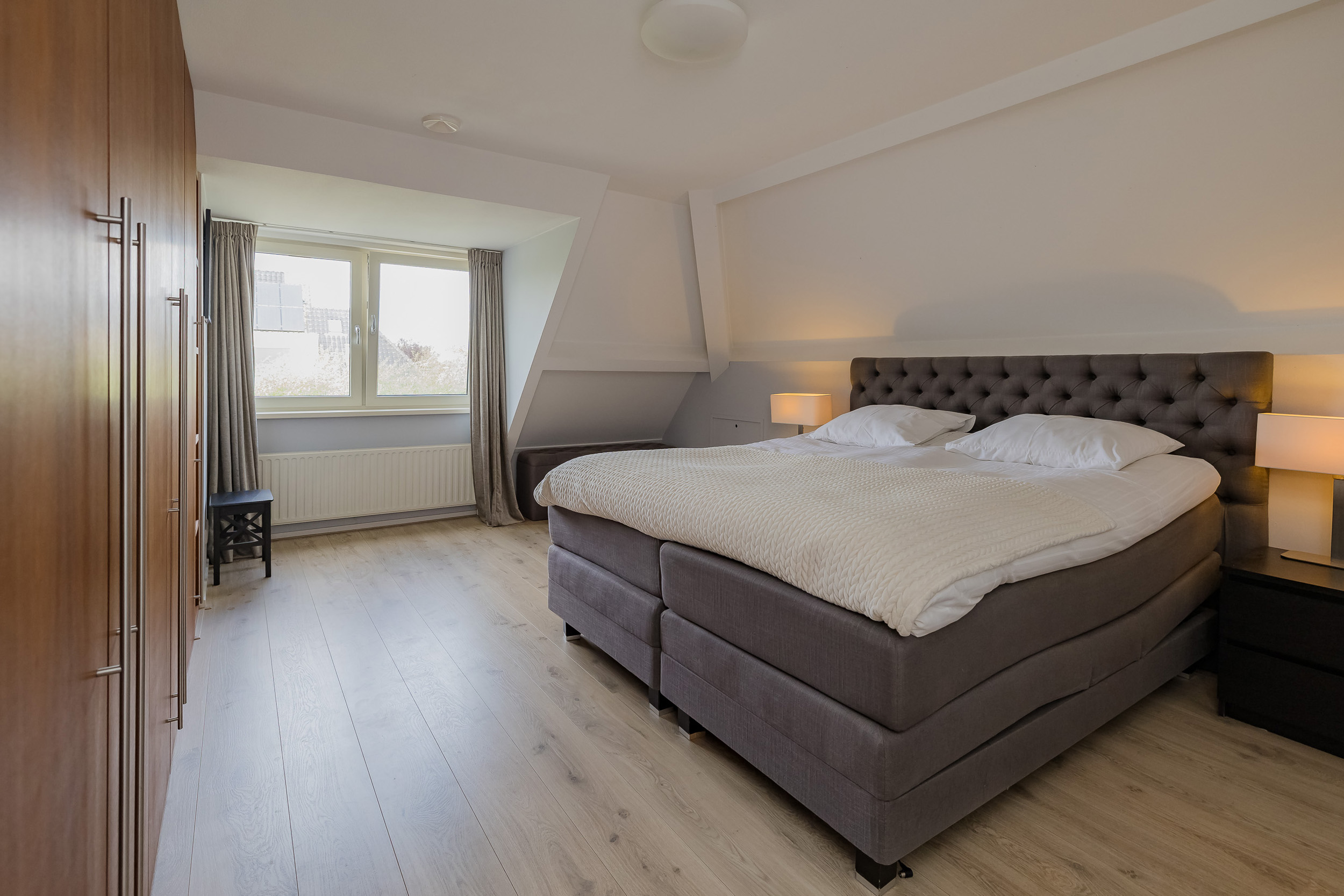 Via de open trap kom je op de eerste verdieping. De vide en overloop zorgen voor een open en ruimtelijk gevoel. Je hebt hier vier royale slaapkamers waarvan er één momenteel in gebruik is als kleedkamer.