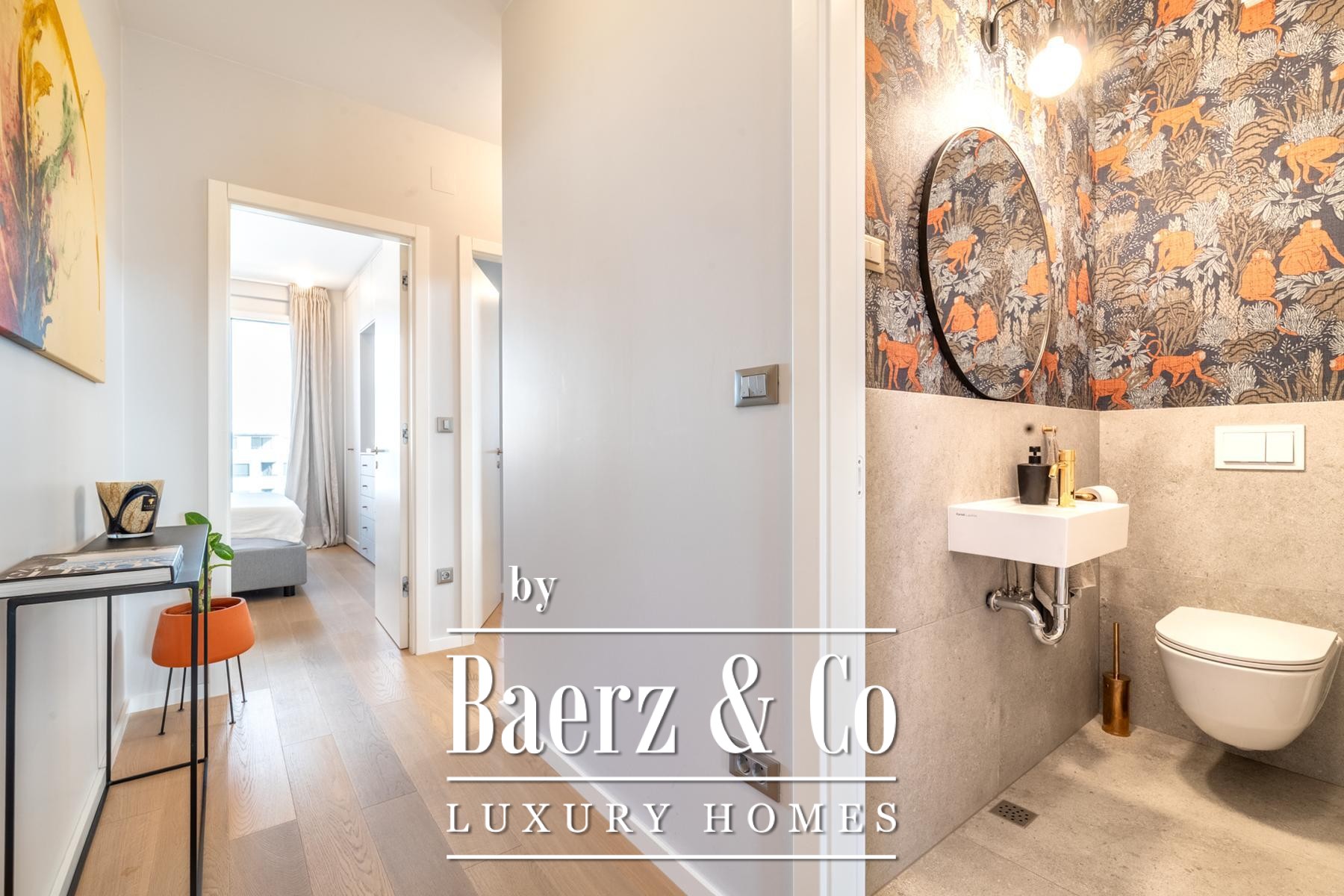 De indeling bestaat uit een lichte woonruimte, een eetgedeelte dat naadloos aansluit op een open keuken ingericht met Miele apparatuur, en twee slaapkamers. Door het gehele appartement ligt eiken parket. Het dagelijks leven wordt verrijkt door verfijnde details, zoals een op maat gemaakte wijnkoelkast en bar elegant geïntegreerd in de woonkamer, maatkasten en minimalistische badkamers afgewerkt met goudkleurig keramiek en hoogwaardige armaturen.