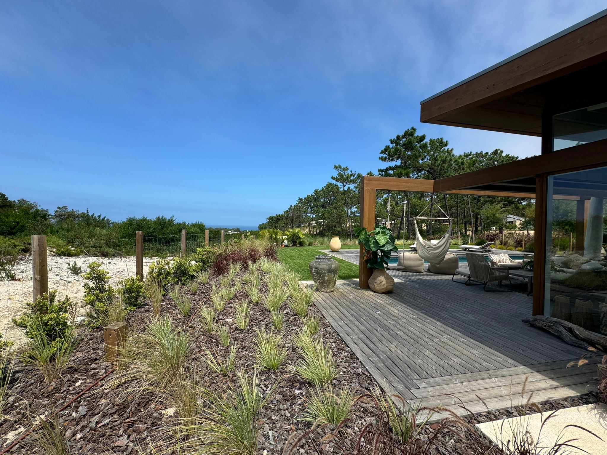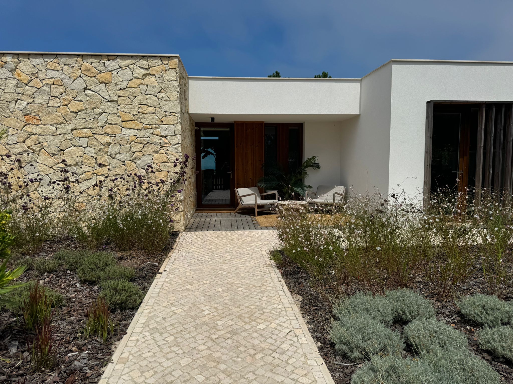 De nabijheid van het landschap wordt benadrukt door de relatie tussen binnen en buiten, door middel van grote glazen schuifpuien, en de harmonie van de gekozen materialen. De keuze van materialen respecteert en versterkt de verbinding met de natuur door het gebruik van steen, hout, kleitegels en de toepassing van uitsluitend warme aardetinten.