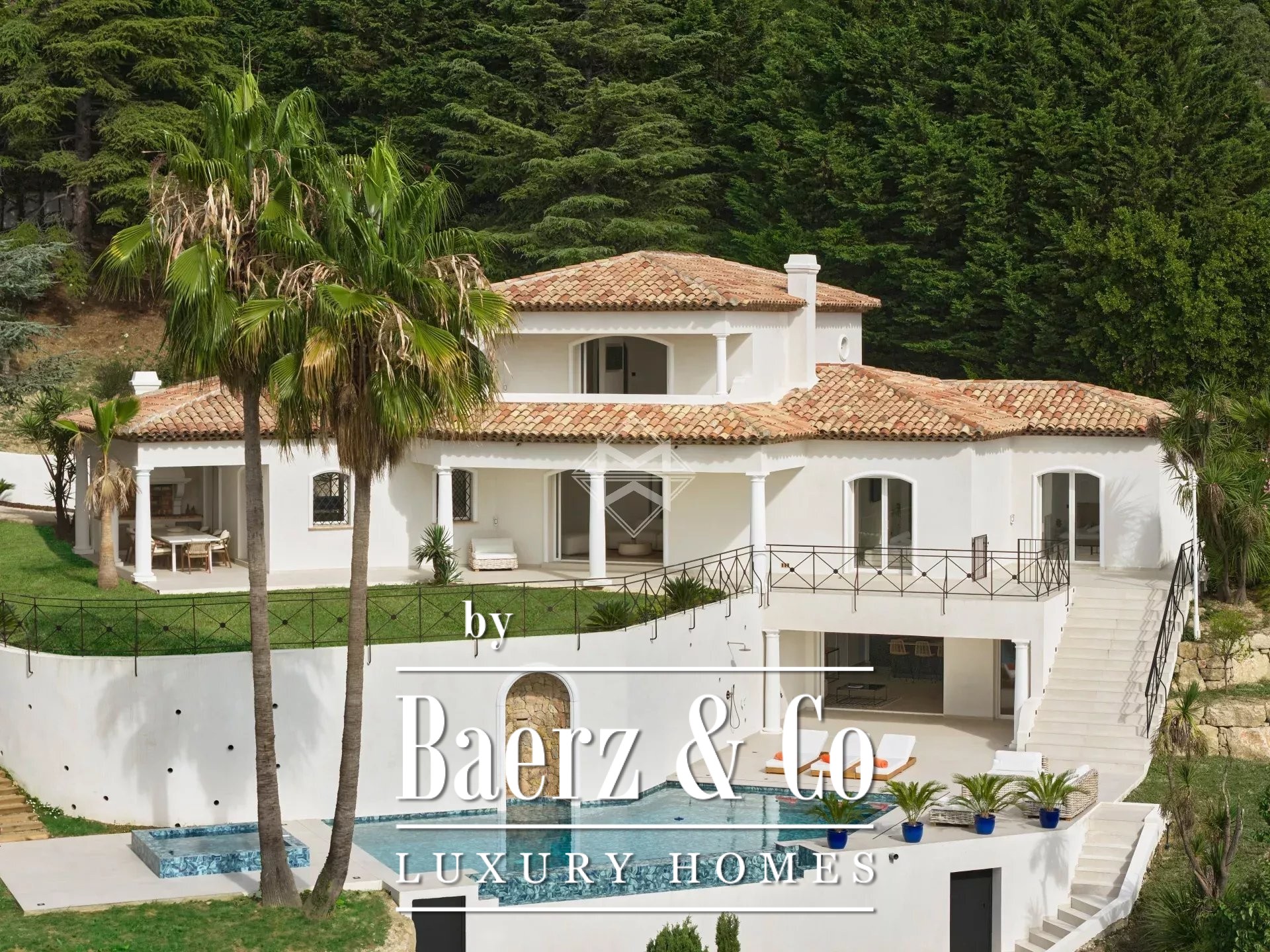 Located in one of the most sought-after areas of Vence, in a commanding position, L'Hacienda stands on a preserved hillside and offers an exceptional panorama: the Mediterranean stretching as far as the eye can see, from Cap Ferrat to Cap d'Antibes, with the majestic Baou de Saint-Jeannet as a backdrop. Completely renovated in 2025 with elegance and refinement, the 260 m² villa, bathed in light, is spread over three levels. On the ground floor, a beautiful entrance hall leads to a large living room opening onto a terrace facing the sea, extended by a dining room and a spacious kitchen. Two bedrooms, a bathroom, a cloakroom, a laundry room, and a guest