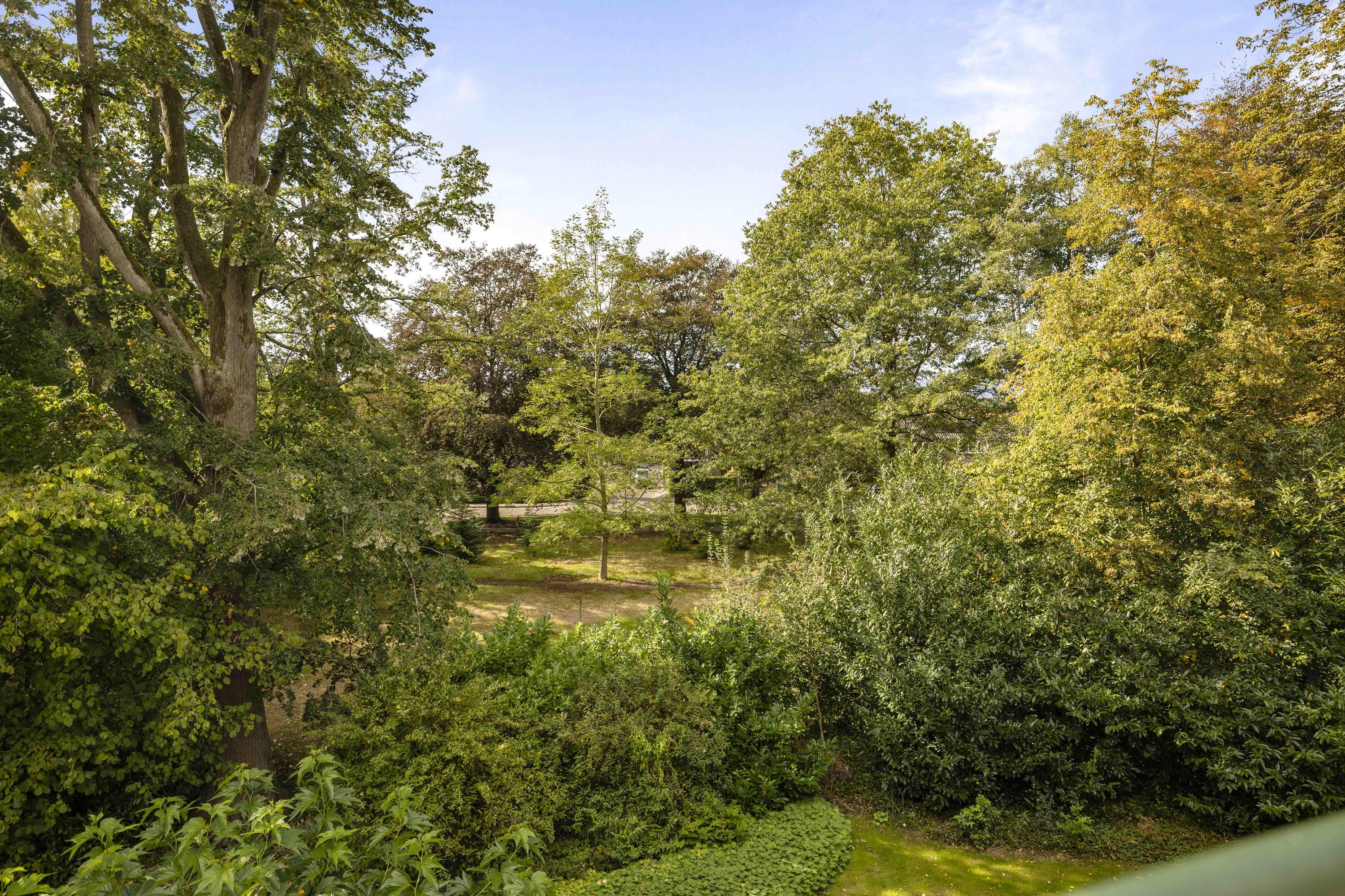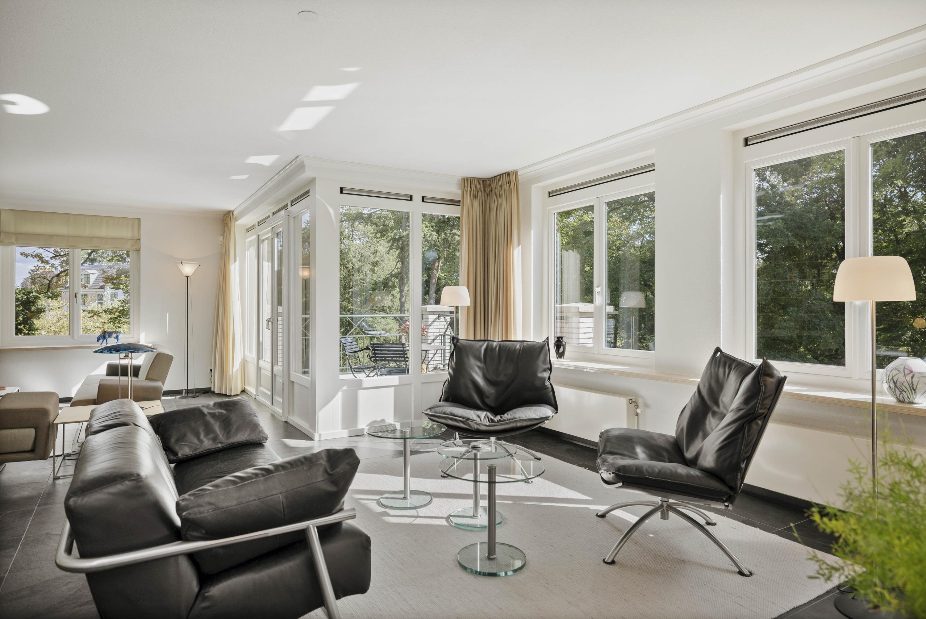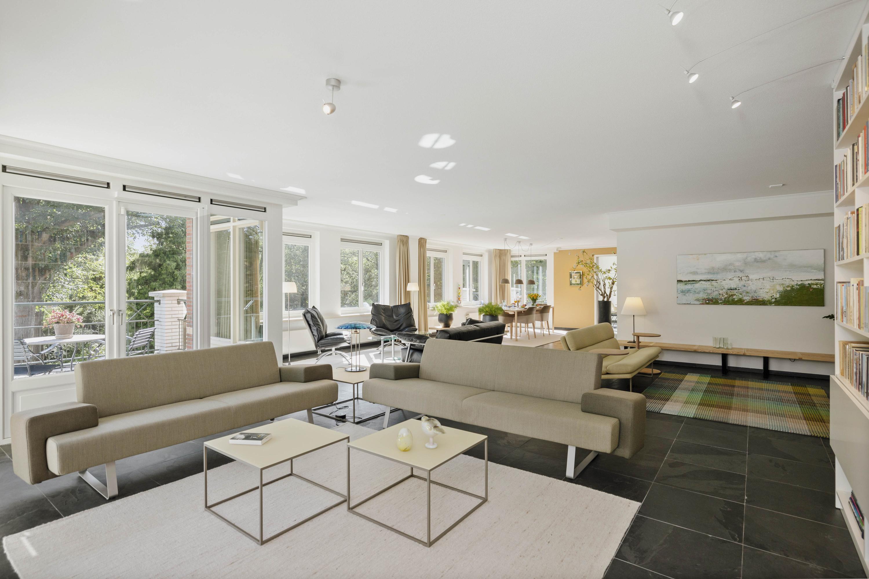De riante woonkamer, met in het verlengde een ruime studeerkamer en-suite, biedt een prachtig uitzicht op het park en heeft openslaande deuren naar alle balkons.