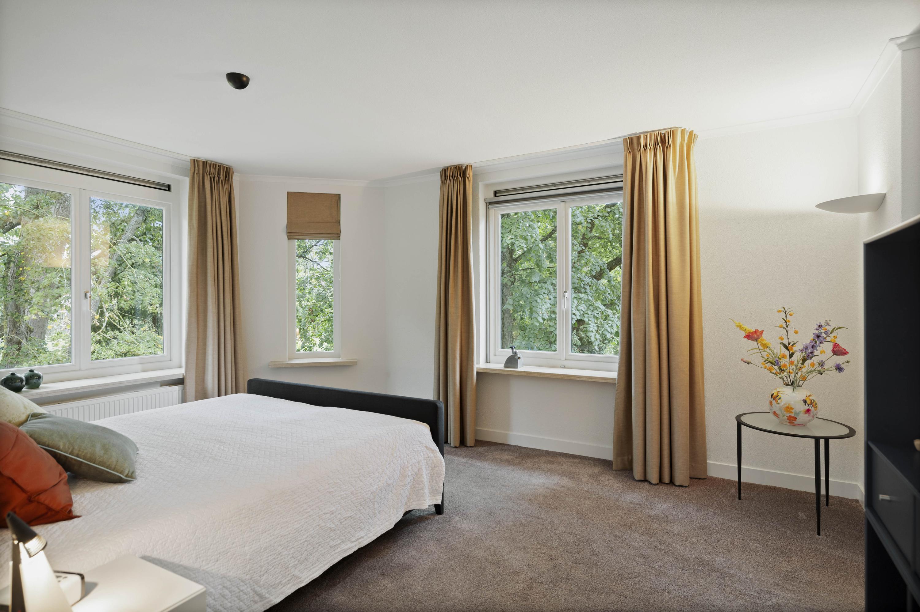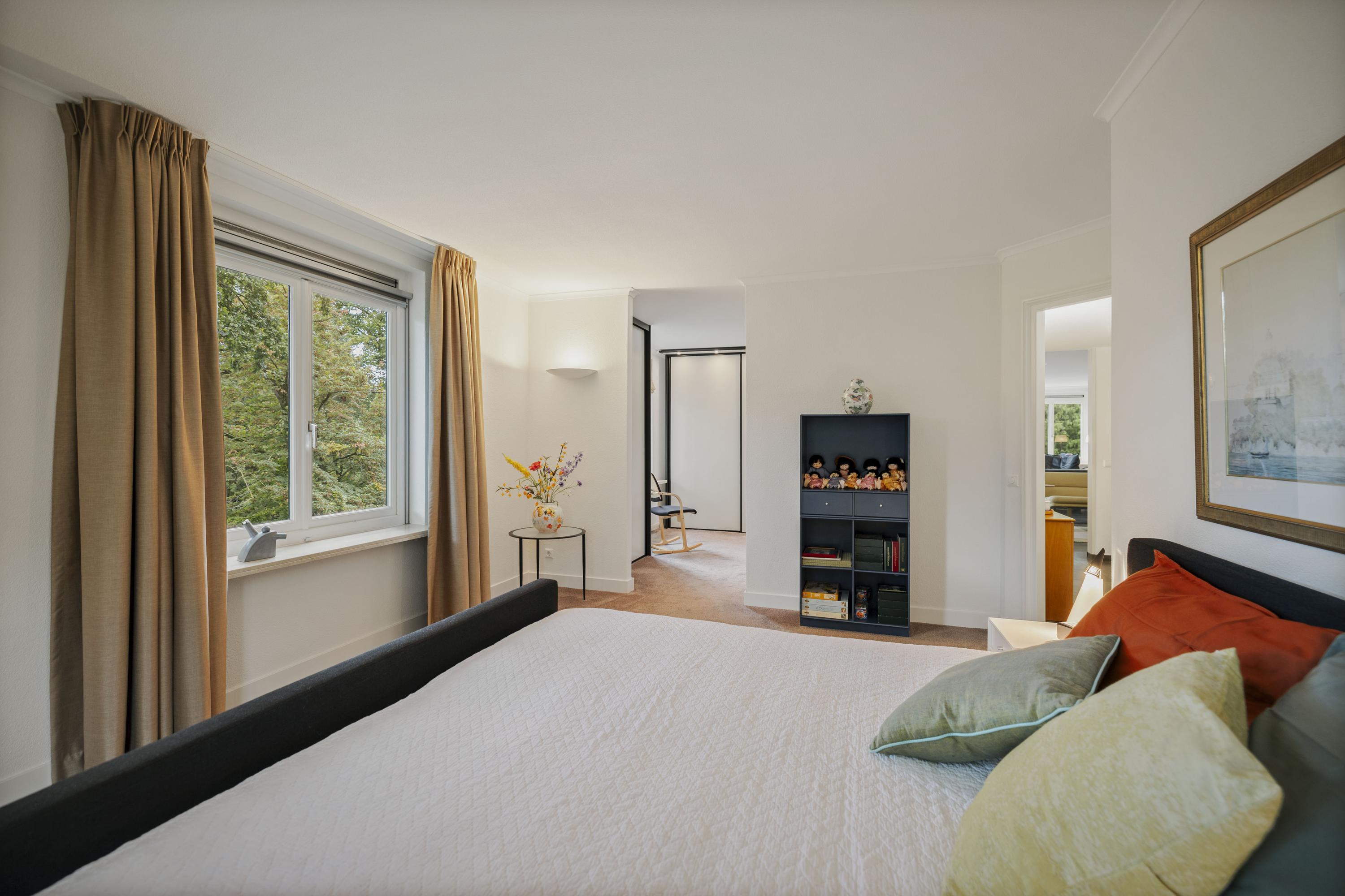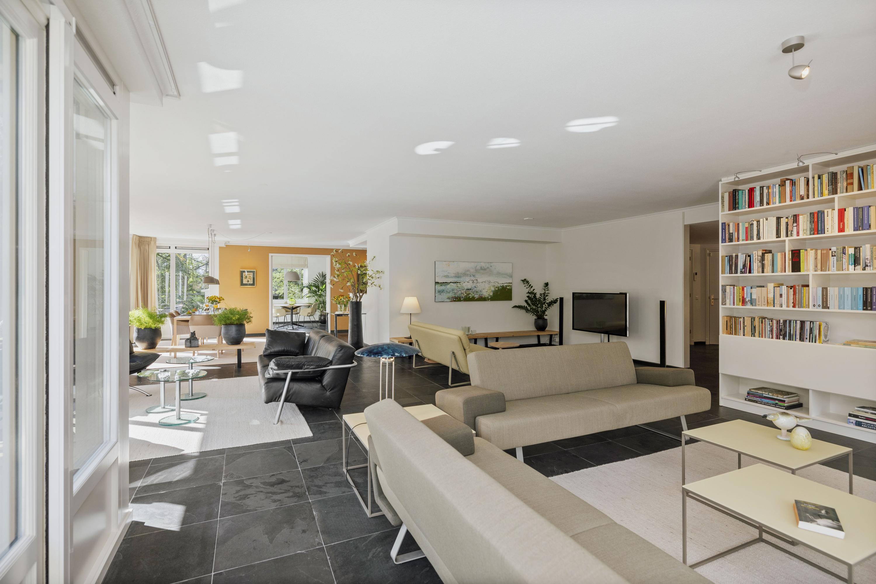 De riante woonkamer, met in het verlengde een ruime studeerkamer en-suite, biedt een prachtig uitzicht op het park en heeft openslaande deuren naar alle balkons.