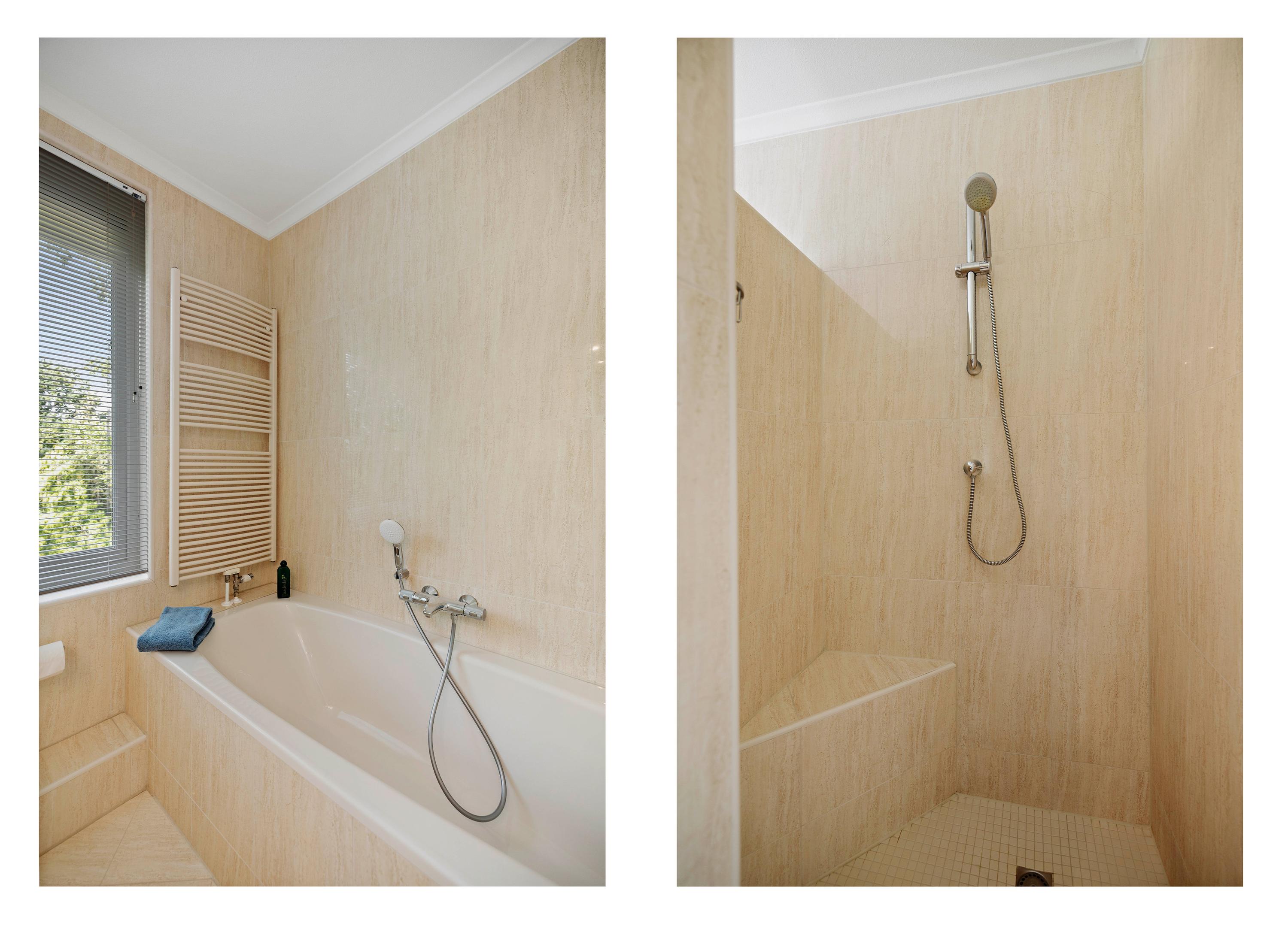 Openslaande deuren geven toegang tot de bijkeuken, twee slaap/hobby-kamers en een tweede badkamer met ligbad, inloopdouche en een dubbele wastafel. De ruime bijkeuken met spoelbak, cv installatie (2021), waterontharder en aansluitingen voor wasmachine en -droger heeft een eigen uitgang naar de entreehal met lift en trappenhuis.