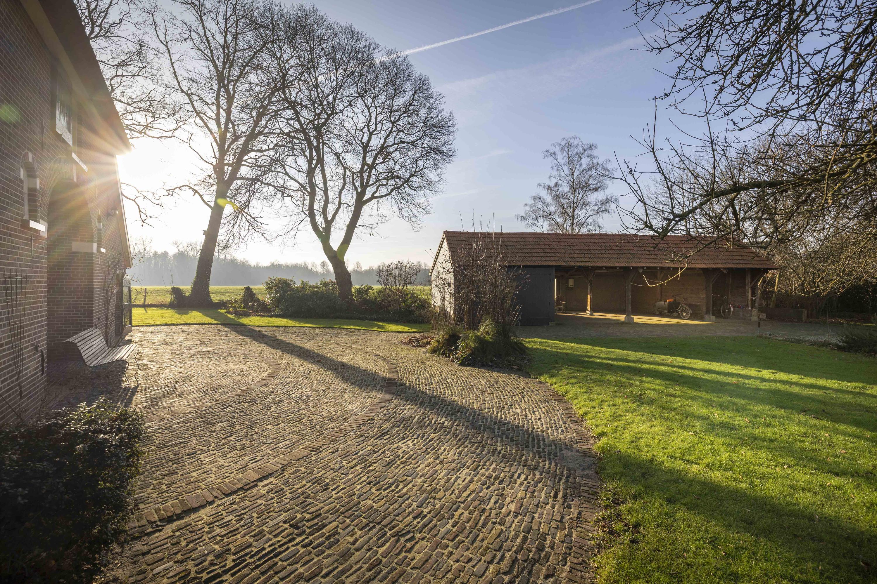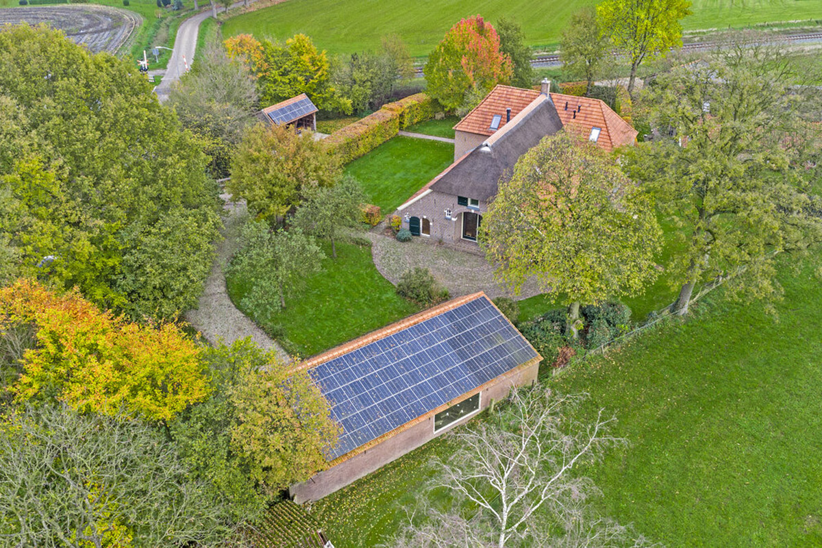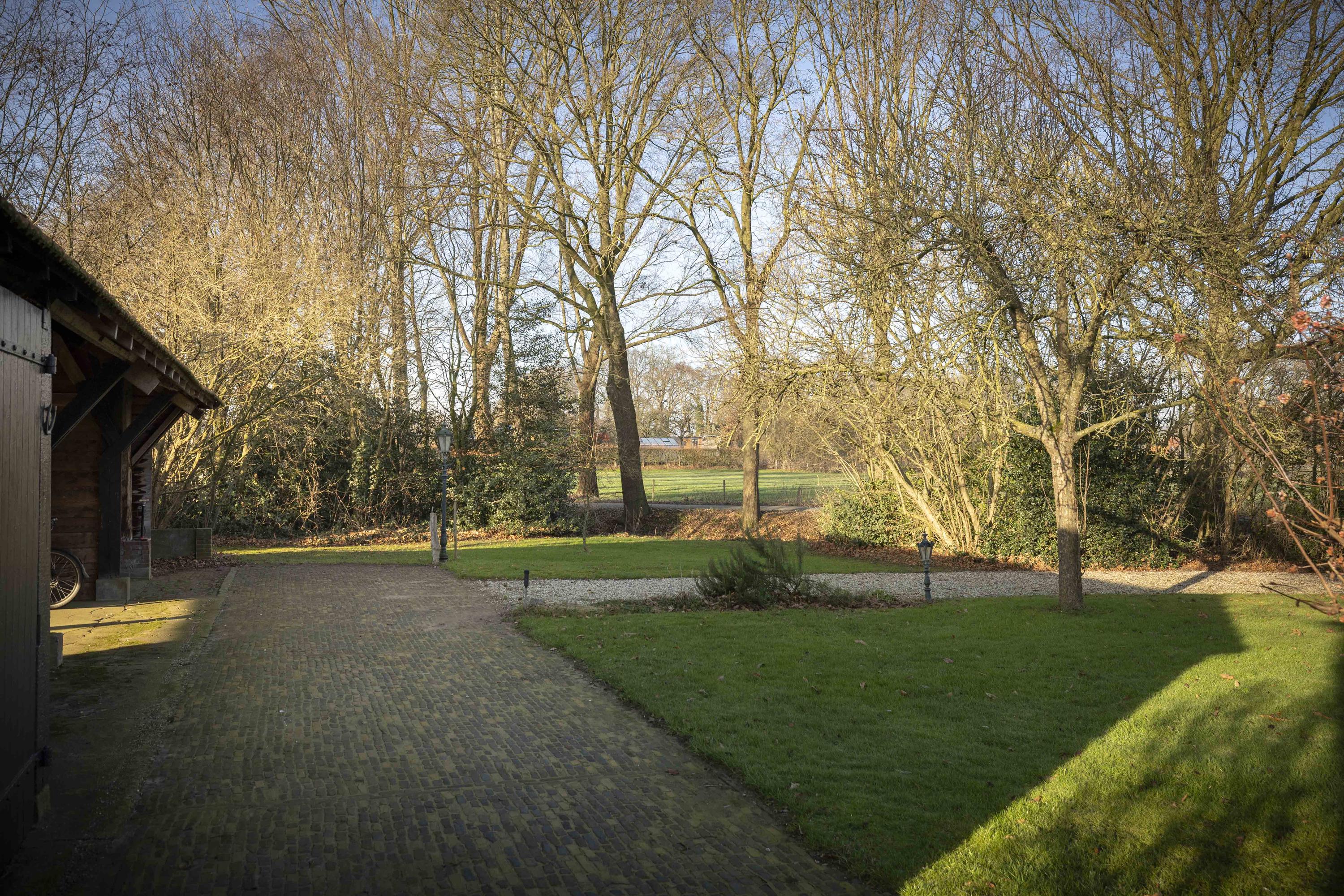 Het huis wordt omringd door een beeldige tuin. Er is een schuur met carport en aan de achterkant een afsluitbare tuingereedschapsberging (met op het dak 39 zonnepanelen - mooi uit het zicht), dus de auto’s staan droog, evenals de tuinspullen. Daarnaast is er een tweede houten bijgebouw (met op het dak 6 zonnepanelen) aanwezig, uitgevoerd in een landelijke stijl met potdekselwerk, Oud-Hollandse dakpannen en robuuste gebinten. Het bijgebouw biedt ruimte aan het parkeren van twee auto’s. Door de oriëntatie van het huis ligt er achter de woning een fijn zonneterras. Zowel aan de voor- als achterzijde zijn er grote gazons en de privacy wordt gewaarborgd door de manshoge beukenhagen. De gazons worden automatisch beregend via een ondergronds Rain Bird beregeningssysteem met pop-up sproeiers, aangesloten op een eigen grondwaterpomp en eenvoudig te bedienen via een app. Hierdoor kunnen het gras en de beplanting efficiënt en duurzaam worden bewaterd. Naast de beukenhagen beschikt de tuin eveneens over volwassen geboomte, waaronder vier appelbomen, een perenboom, een monumentale tamme kastanje alsmede een monumentale walnotenboom.
