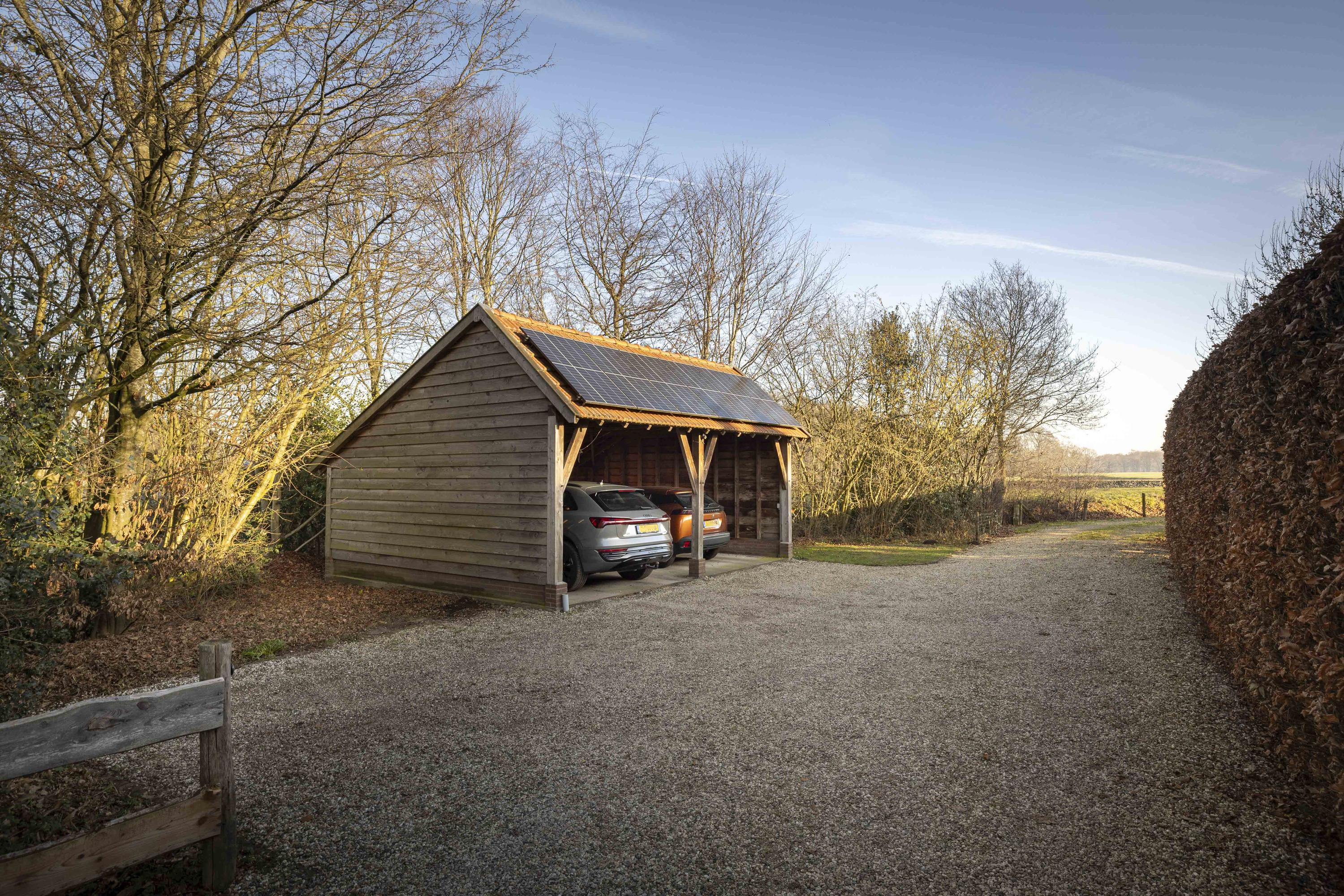 Duurzaamheid: Het geheel beschikt over 45 zonnepanelen alsmede een dubbele laadpaal in de aanwezige dubbele carport annex wagenloods