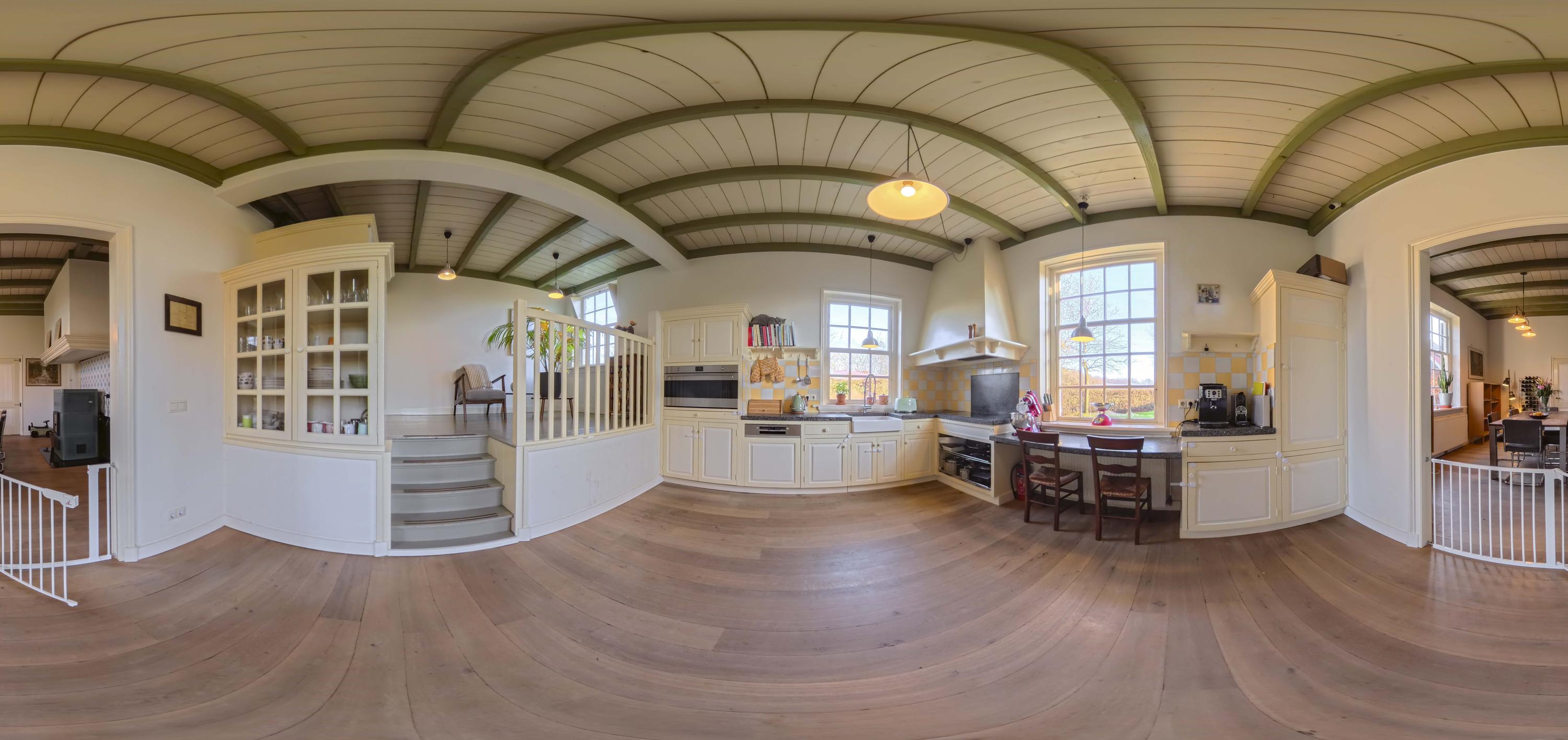 De keuken, met knusse opkamer, strookt qua look-and-feel helemaal met de nostalgie die het huis ademt, maar is verrassend modern en van alle gemakken voorzien; een keuken voor fijnproevers! De handgemaakte keuken is uitgerust met crèmekleurige houten fronten – er is hier veel bergruimte - en een werkblad van gezoete hardsteen. Koken gebeurt hier op de extra brede inductieplaat, en ook qua inbouwapparatuur is het piekfijn voor elkaar, met een koelvriescombinatie, een extra brede heteluchtoven (90 cm, SMEG) en een afwasmachine (Bosch). Onder de opkamer bevindt zich de tweede voorraadkelder.