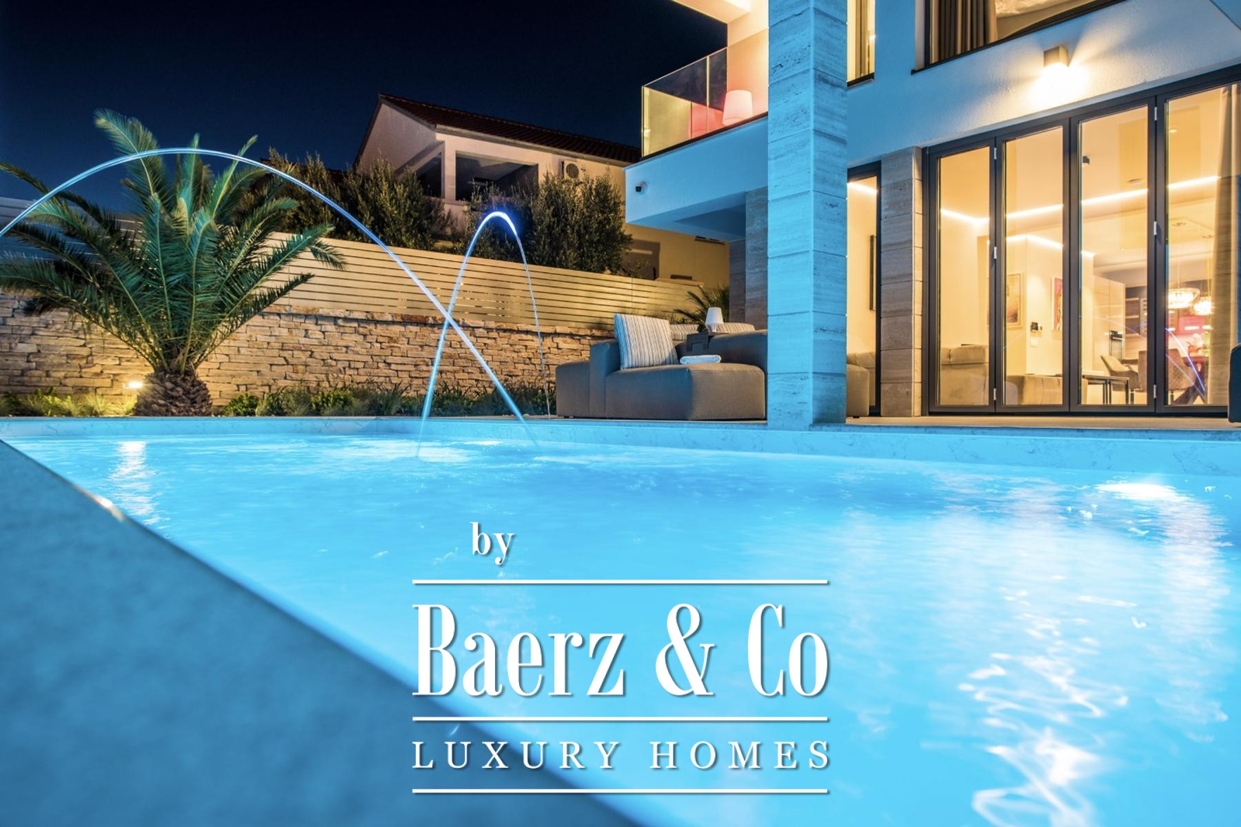 In totaal biedt het complex 370,65 m² woonoppervlakte op een fraai aangelegd perceel van 806 m², met vier slaapkamers en vier badkamers. Voorzieningen omvatten een sauna, jacuzzi op het dakterras, twee eigentijdse keukens, een home cinema, geïntegreerde audio- en beveiligingssystemen, automatische irrigatie, een gedeeld zwembad en buitendouches. De tuin is beplant met Mediterrane soorten en er zijn vier parkeerplaatsen beschikbaar. Deze exclusieve villa te koop in Vrsi is zowel een verfijnd privéverblijf als een investering van hoge kwaliteit voor veeleisende internationale kopers.