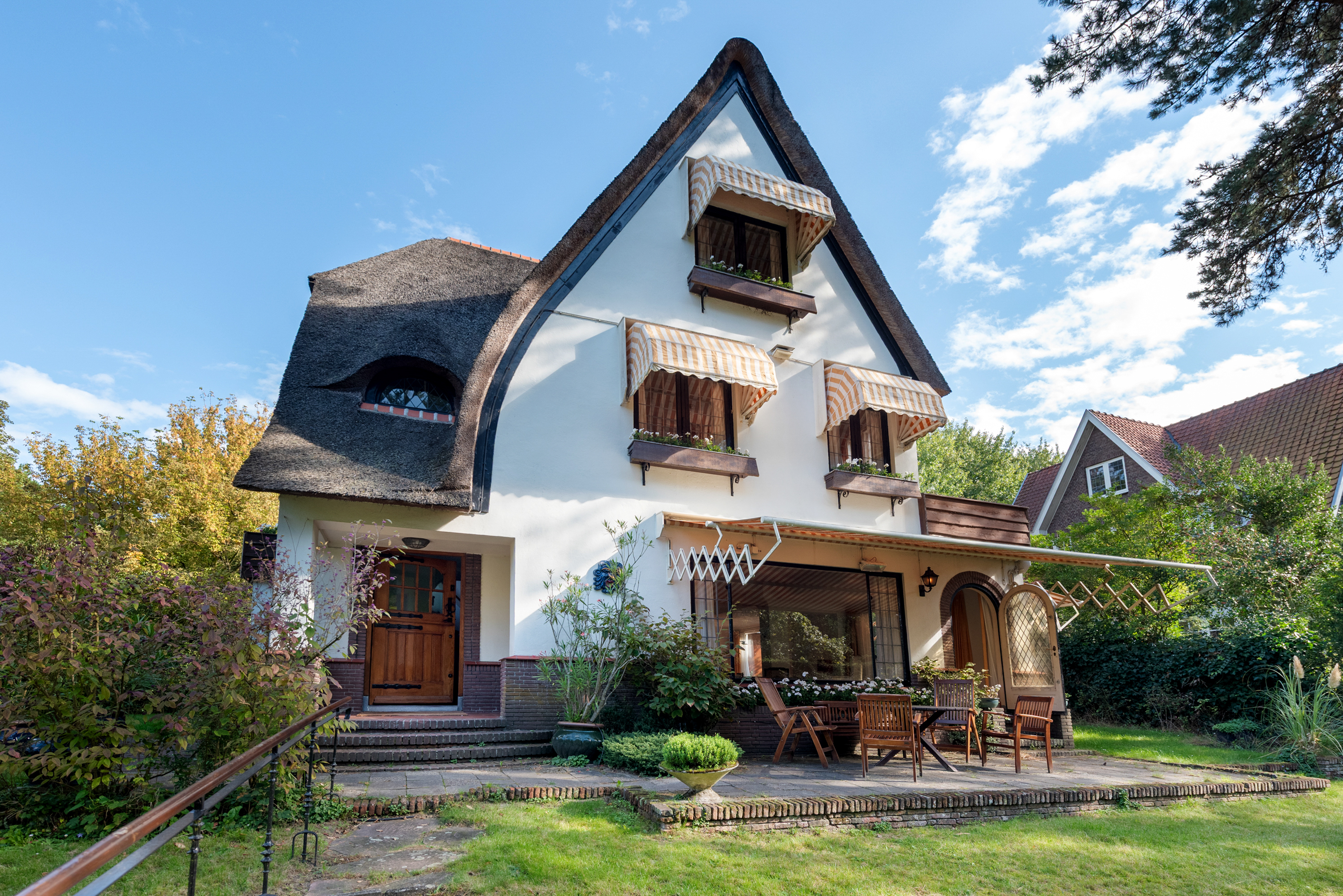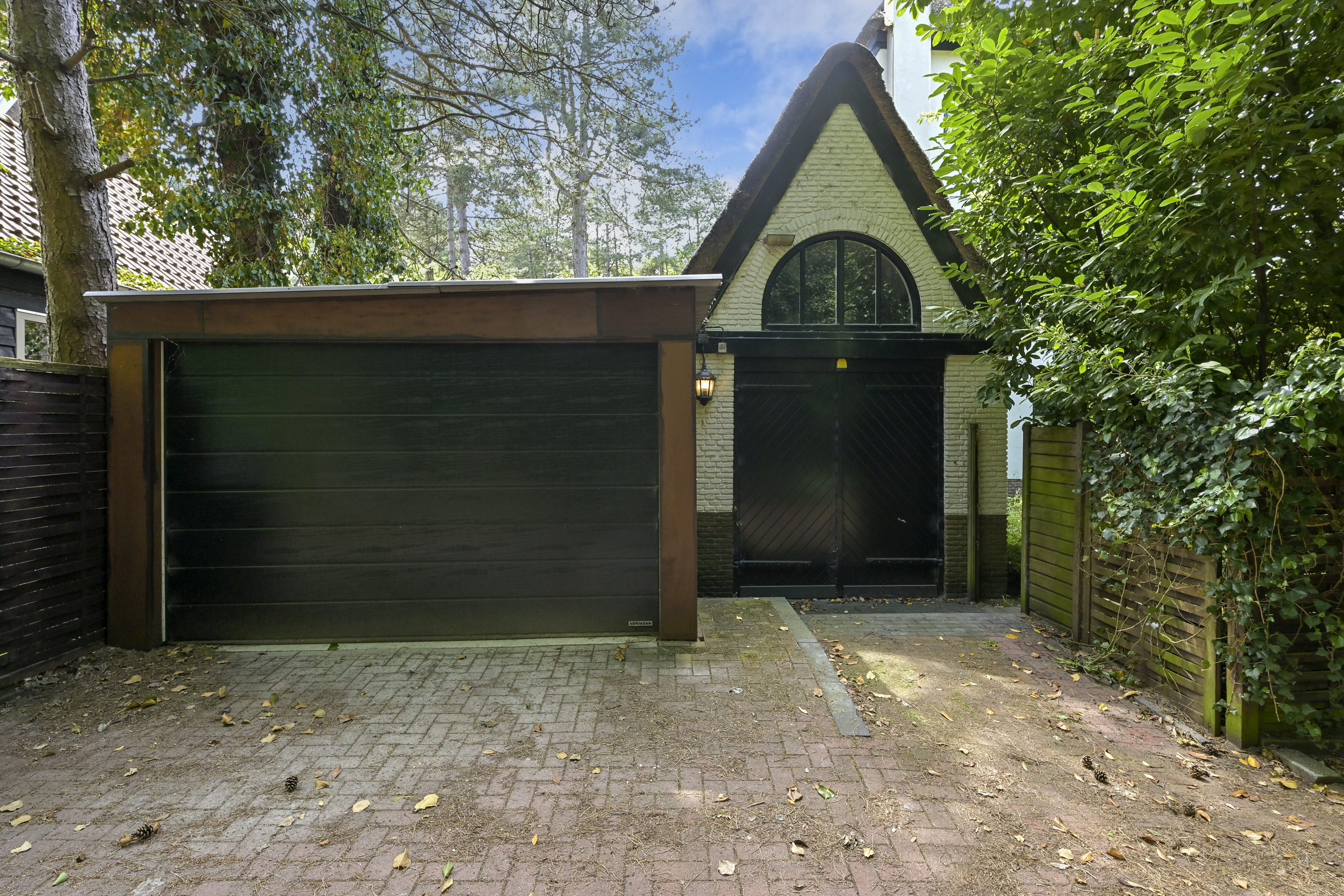 De tuin ligt half rondom de woning en is vrij gelegen en dus heel zonnig. Naast de oorspronkelijke garage die ooit verbonden was met de eetkamer en dus eenvoudig bij het huis zou kunnen worden getrokken is een nieuwere grote garage op het perceel aangebouwd die voor vele doeleinden geschikt is. Deze laatste heeft een automatische kanteldeur en heeft een doorloop naar de achtertuin.