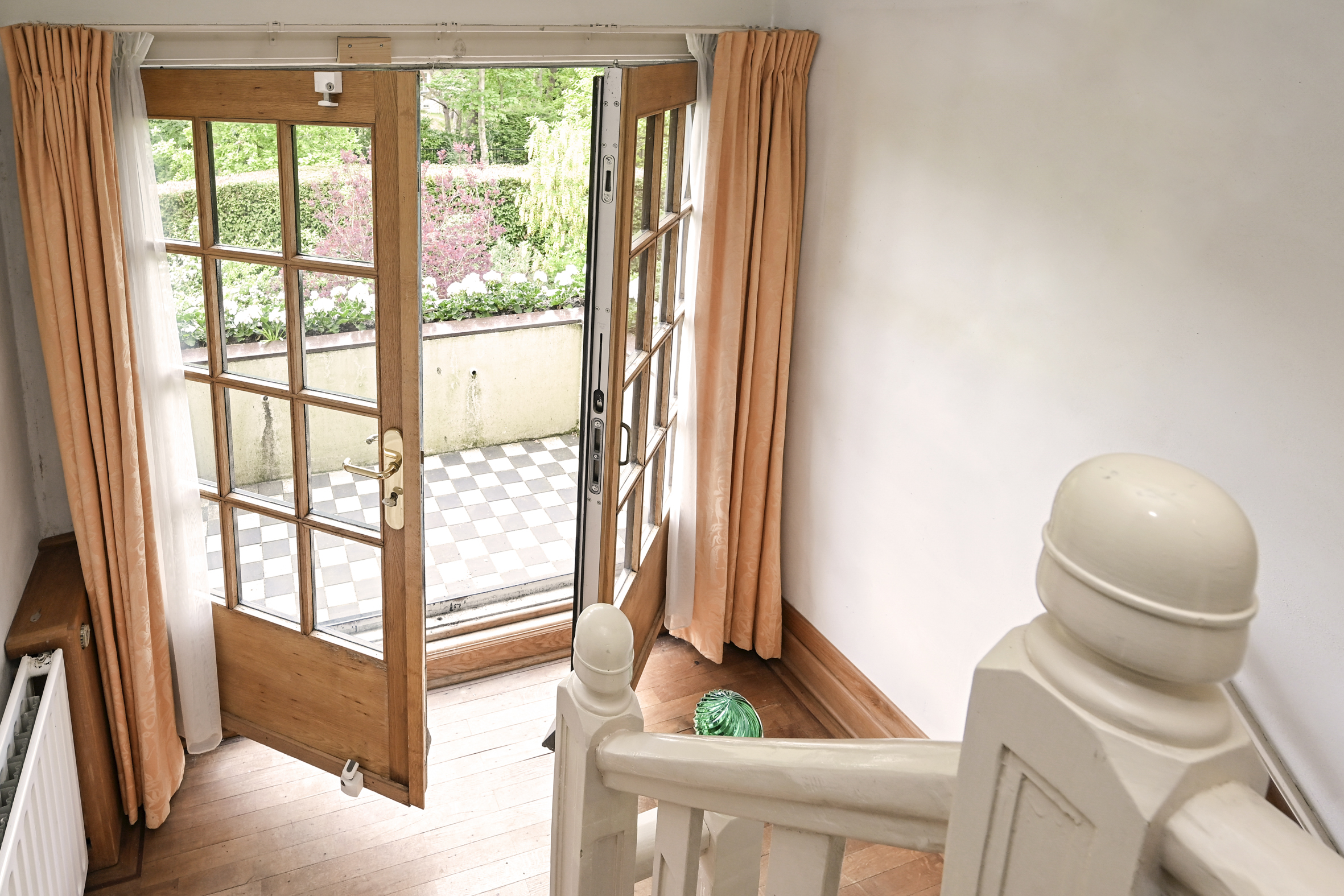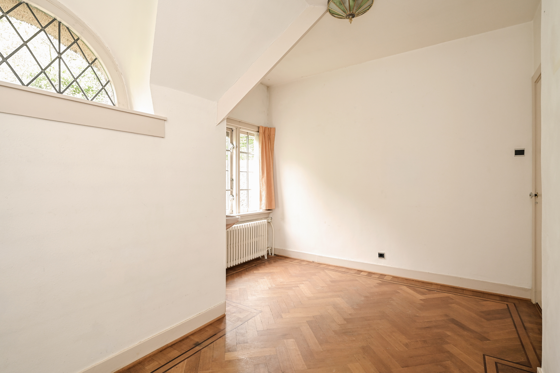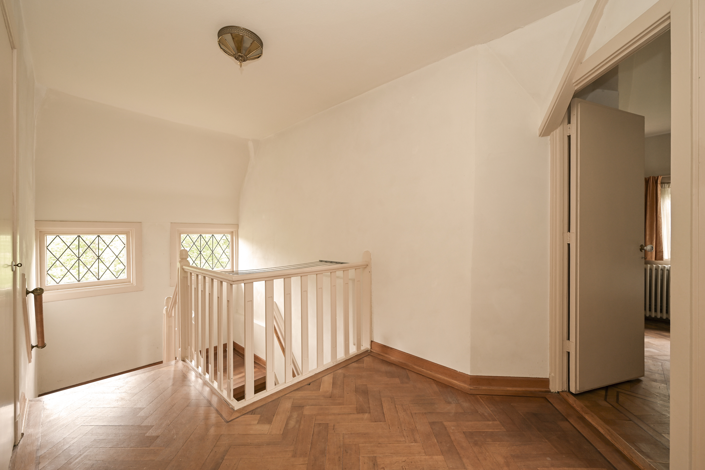Het fraaie lichte bordestrappenhuis met halverwege toegang tot een balkon leidt naar de 1e verdieping waar we naast een eenvoudige badkamer en een aparte douche een fraaie studeerkamer met toegang tot ruim balkon vinden en twee ruime slaapkamers. Zoals benoemd zijn alle vertrekken voorzien van eiken parketvloeren.