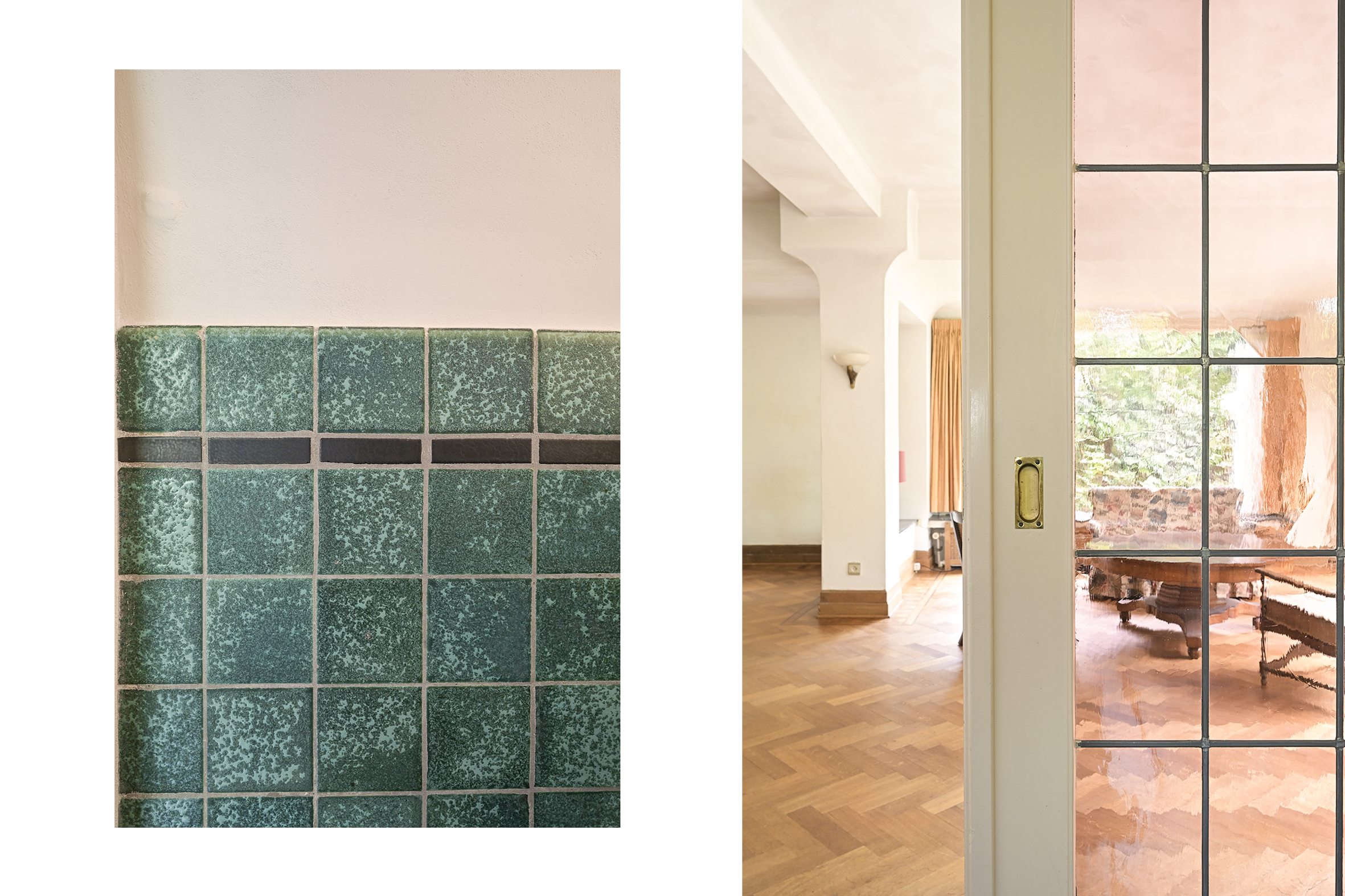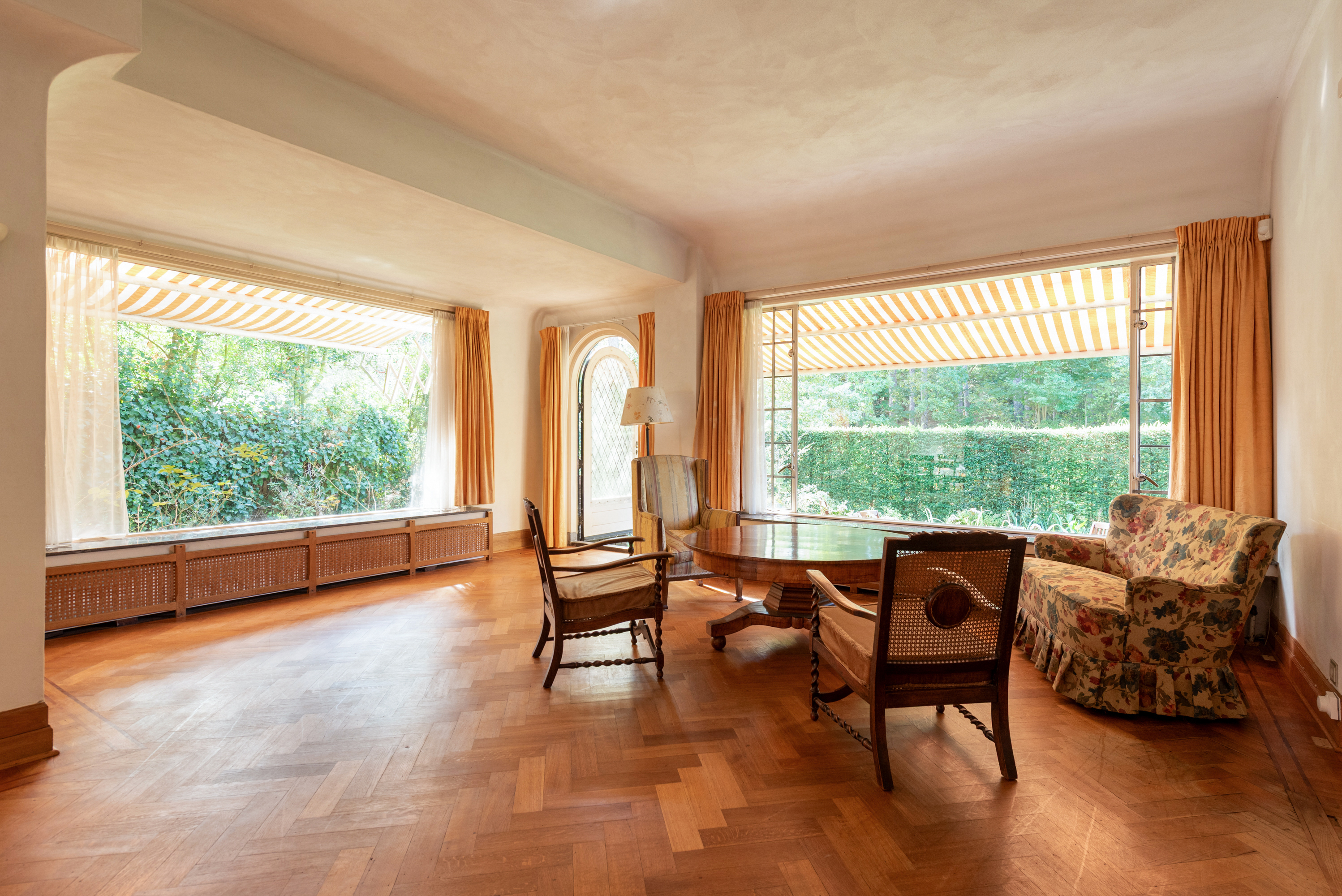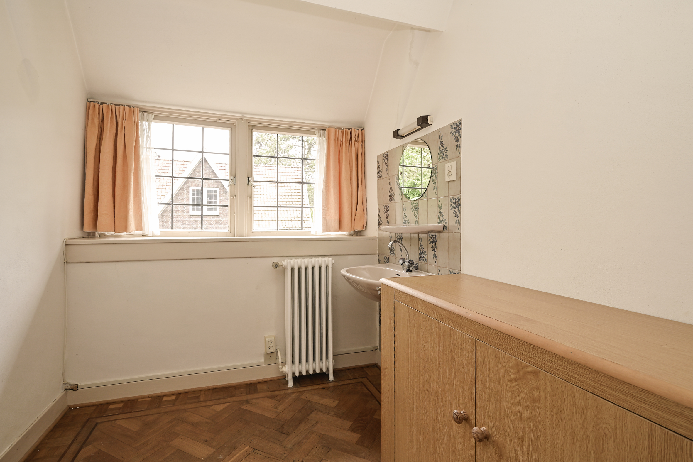 Het fraaie lichte bordestrappenhuis met halverwege toegang tot een balkon leidt naar de 1e verdieping waar we naast een eenvoudige badkamer en een aparte douche een fraaie studeerkamer met toegang tot ruim balkon vinden en twee ruime slaapkamers. Zoals benoemd zijn alle vertrekken voorzien van eiken parketvloeren.