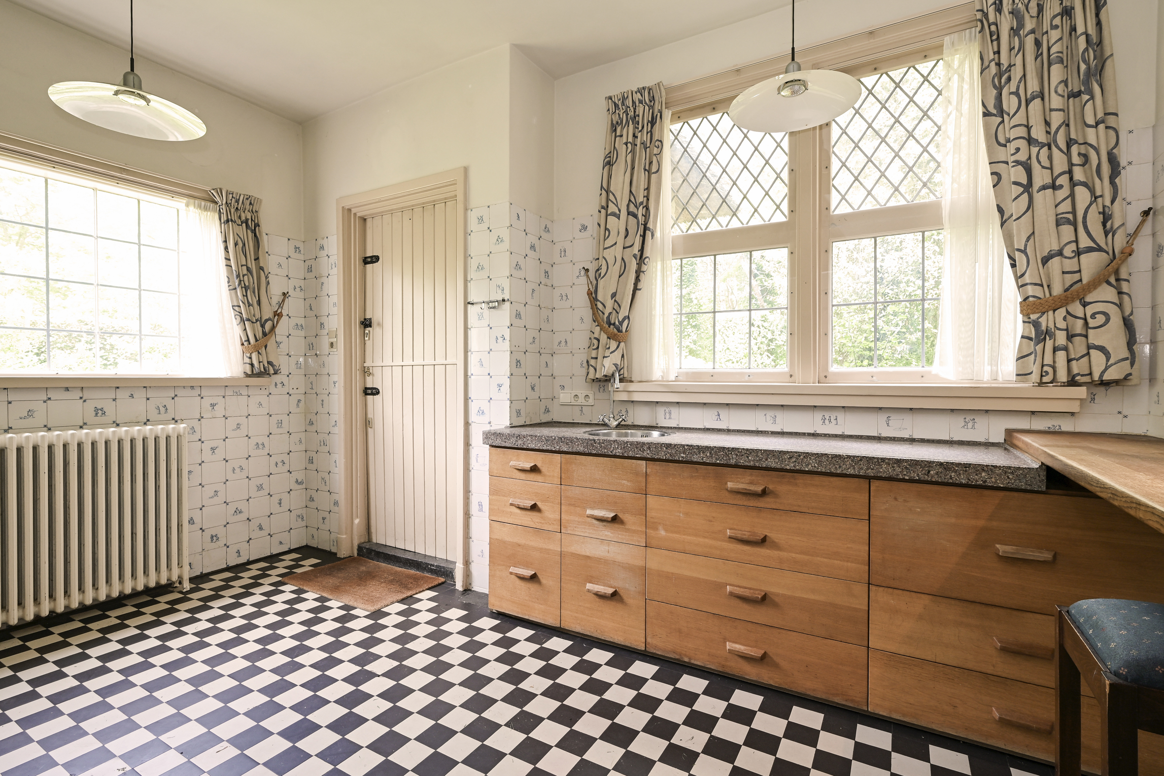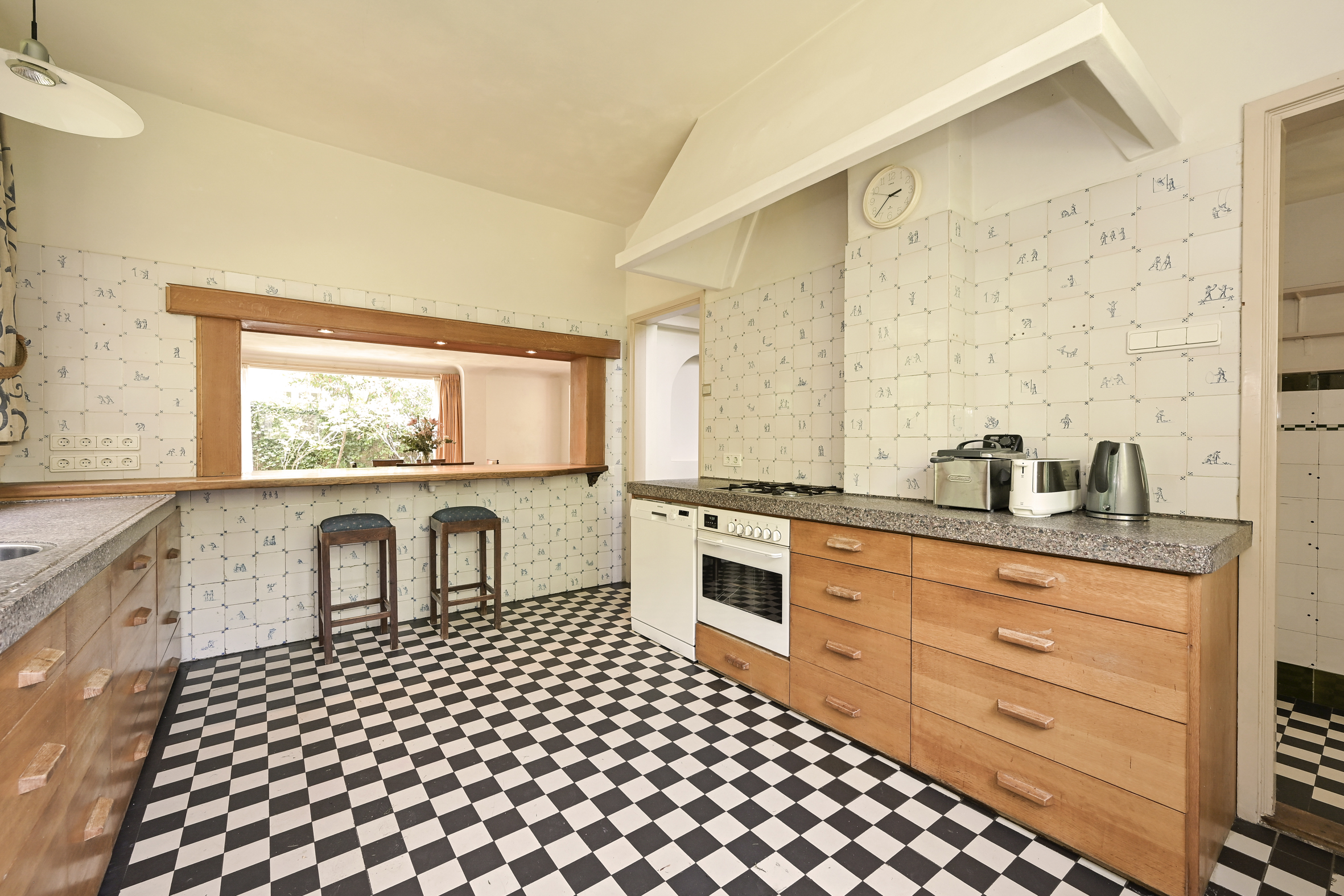 Indeling: entree, royale ontvangsthal met fraaie in mozaïek gelegde vloer, riant trappenhuis, eenvoudige wc met fonteintje. Dubbele schuifdeuren met glas in lood ramen naar ruime lichte zit/eetkamer met eiken parketvloeren, open haard, marmeren vensterbanken en toegang tot de zonnige tuin. Vanuit de centrale hal is de ruime nette keuken bereikbaar die middels een halfopen verbinding in contact met eetkamer staat. De keuken heeft een achter entree en heeft een aangrenzende bijkeuken met toegang tot de kelder die uit drie praktische ruimtes bestaat.