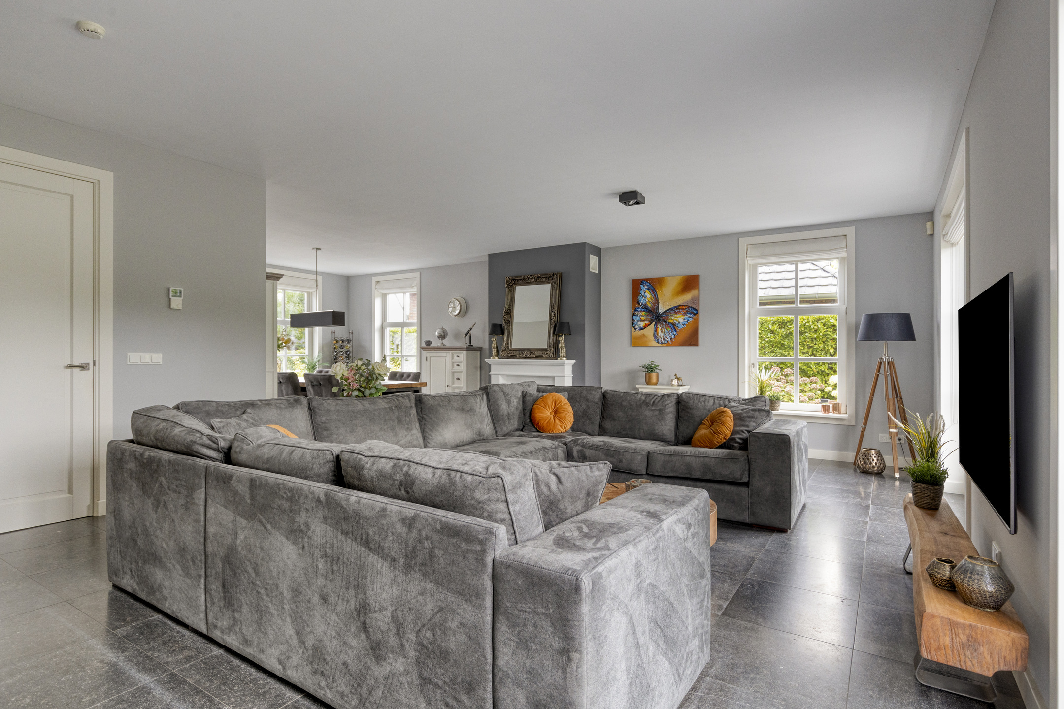 Woonkamer (ca. 75,5 m² incl. keuken): royale L?vormige living met openslaande tuindeuren naar tuin/terras. De stijlvolle en elegante stenen schouw met inbouwhaard vormt een blikvanger in het interieur. De wanden ( met geïntegreerde luidsprekers ) zijn gestuct, natuurstenen vloer en het plafond met diverse lichtpunten en inbouwspots.