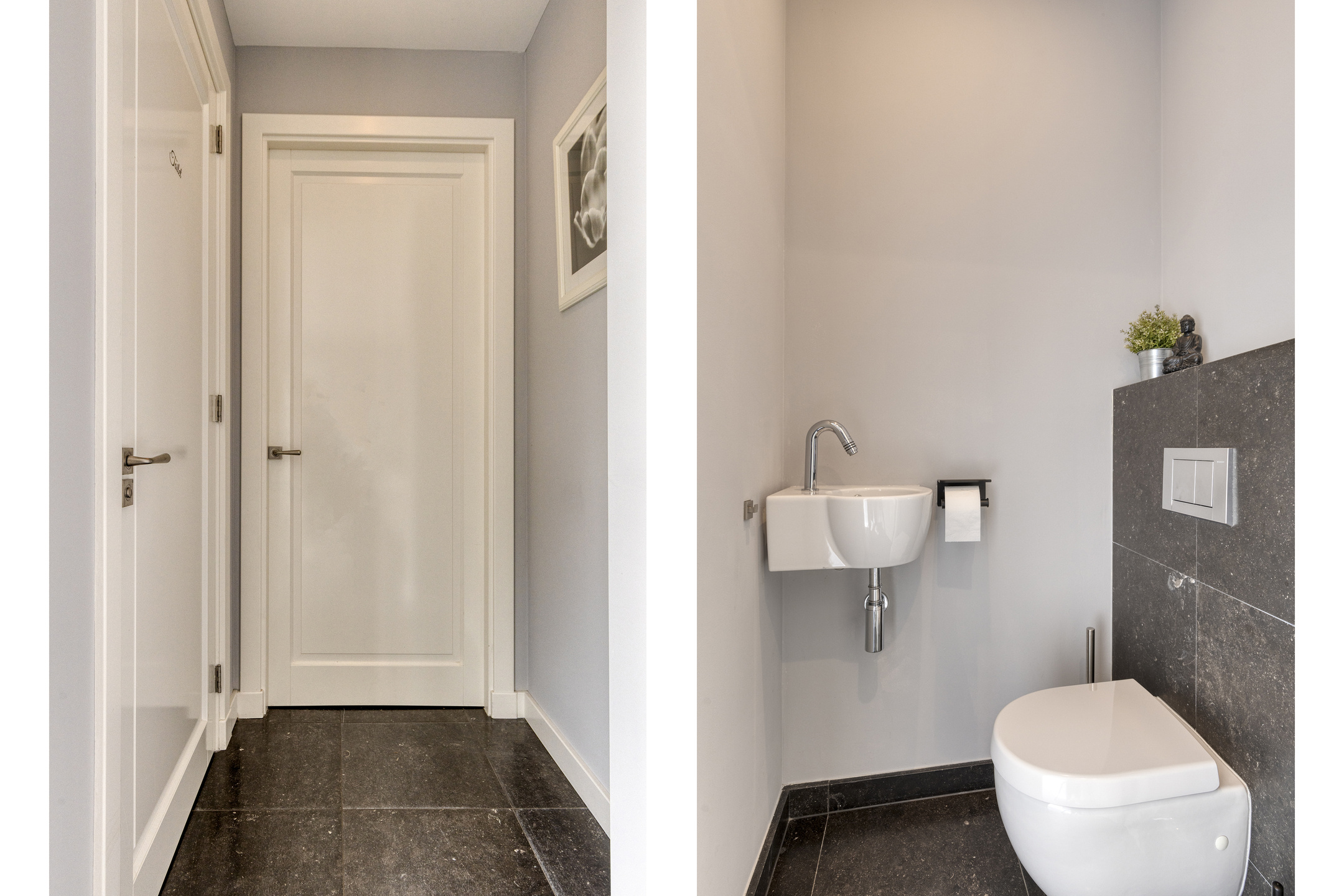 Toilet: modern betegeld, met wandcloset en fonteintje; wanden in stucwerk en natuursteen; natuurstenen vloer; plafond met inbouwspots.