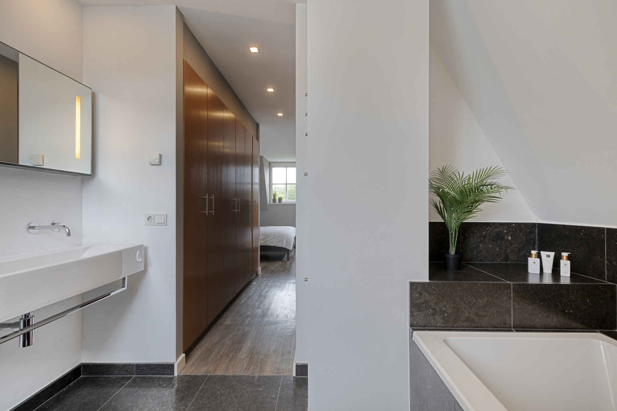 Luxe Badkamer en-suite: afgewerkt met natuursteen; voorzien van ruim ligbad, inloopdouche, dubbele wastafel en stortkoker richting bijkeuken.