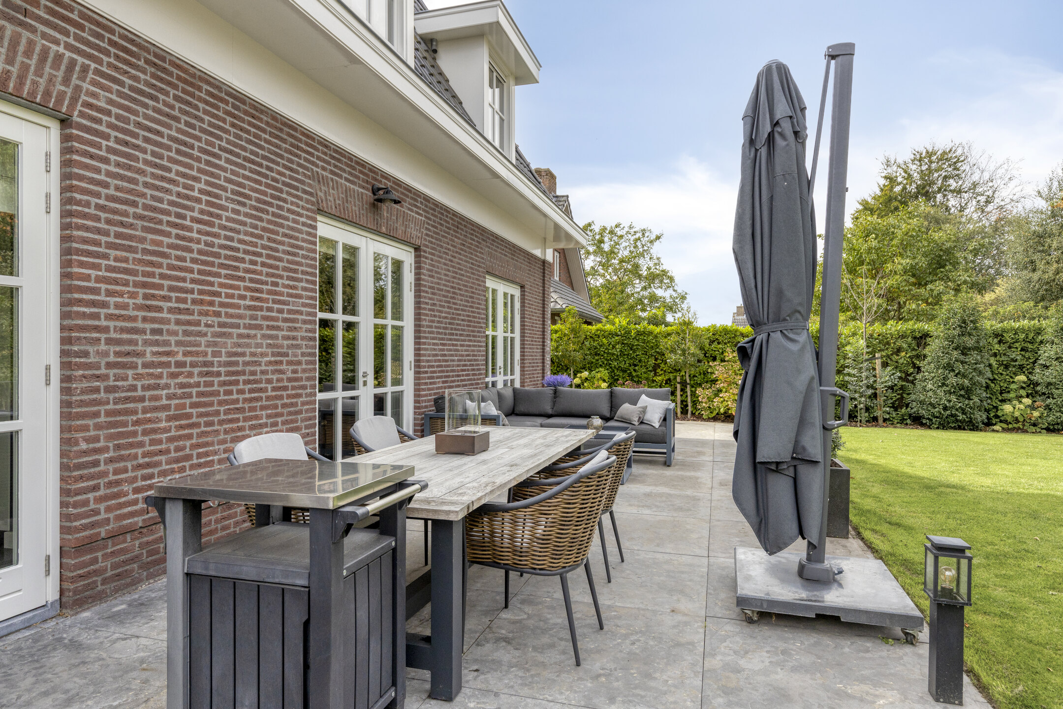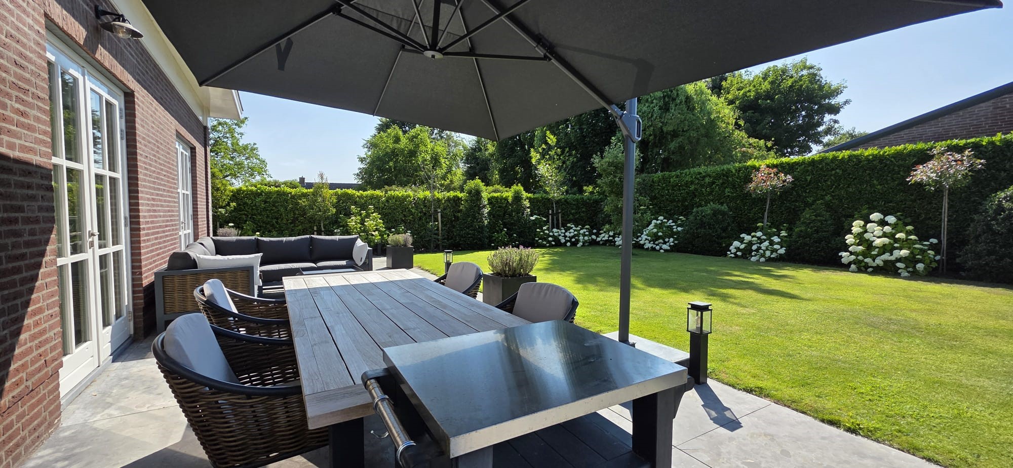 Fraai aangelegde tuin, volledig rondom omheind; met borders, gazon, buitenkraan, beregeningsinstallatie, tuinverlichting en natuurstenen terrassen.