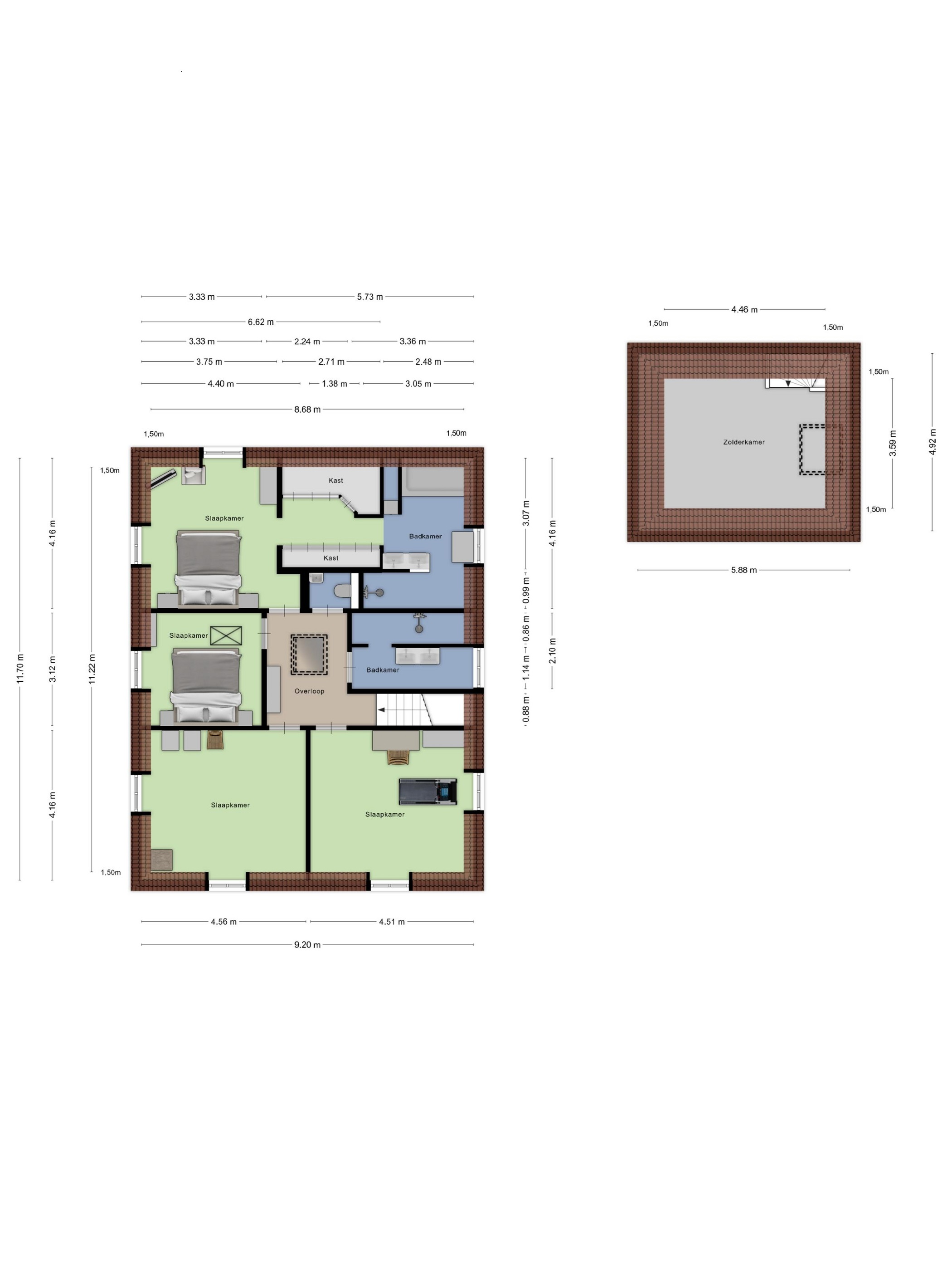 3 overige slaapkamers: elk met twee dakkapellen; wanden gestuct; PVC?vloer; plafonds met inbouwspots; vanuit de middelste slaapkamer een vlizotrap naar de 2e verdieping.